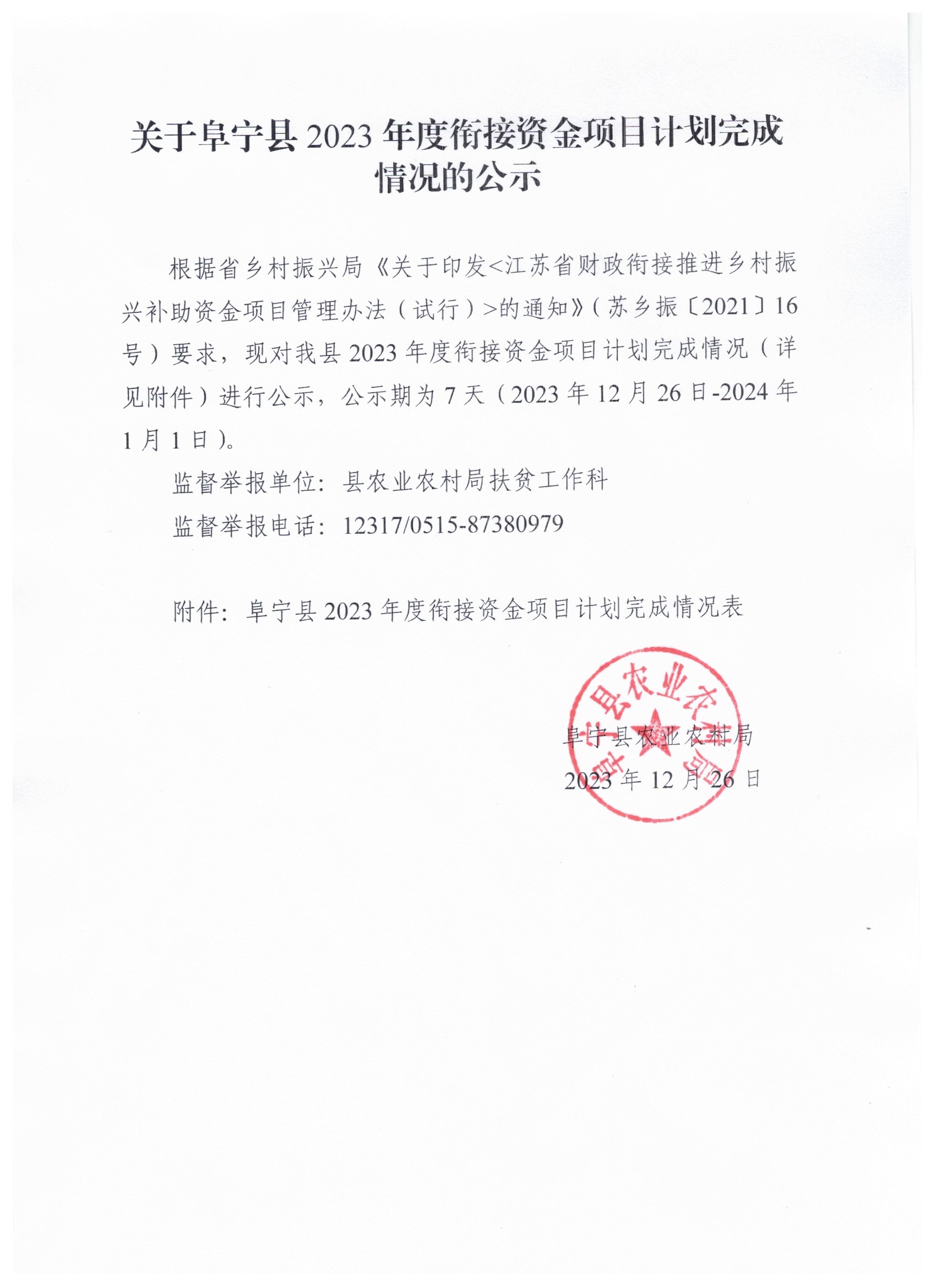 关于阜宁县2023年度衔接资金项目计划完成情况的公示