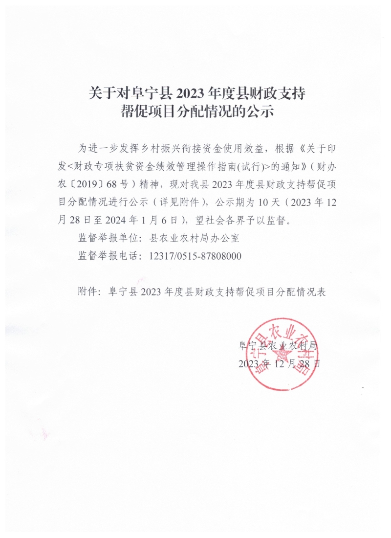 关于对阜宁县2023年度县财政支持帮促项目分配情况的公示