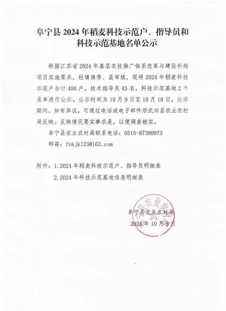 阜宁县2024年稻麦科技示范户、指导员暨科技示范基地名单公示