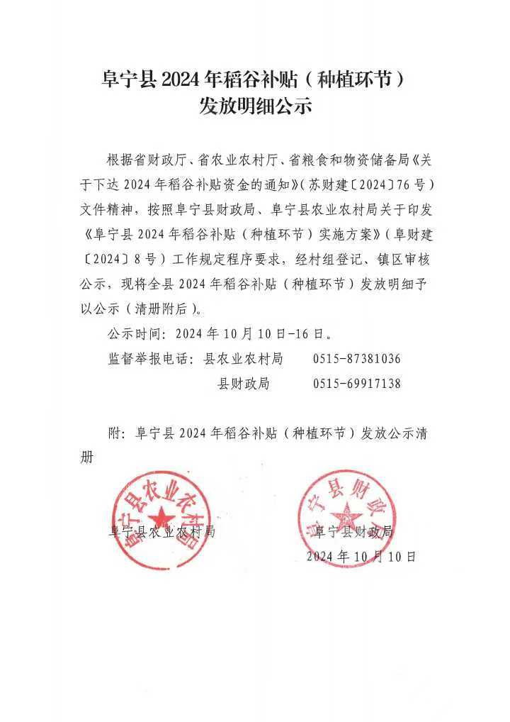 阜宁县2024年稻谷补贴(种植环节)发放明细公示