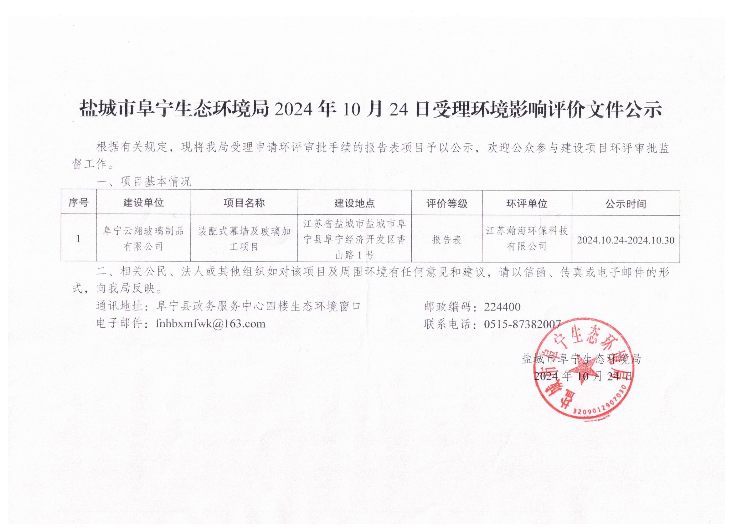盐城市阜宁生态环境局2024年10月24日受理环境影响评价文件公示