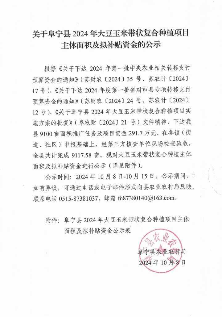 关于阜宁县2024年大豆玉米带状复合种植项目主体面积及拟补贴资金的公示