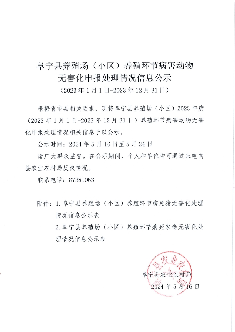 阜宁县2023年度养殖场(小区)养殖环节病害动物无害化申报处理情况信息公示