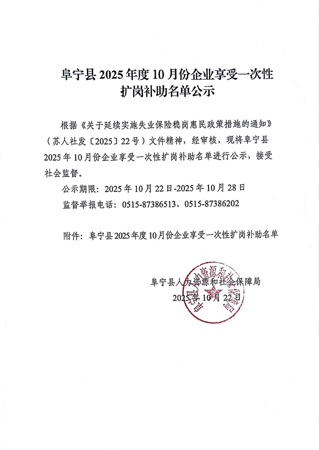 阜宁县2025年度10月份企业享受一次性扩岗补助名单公示