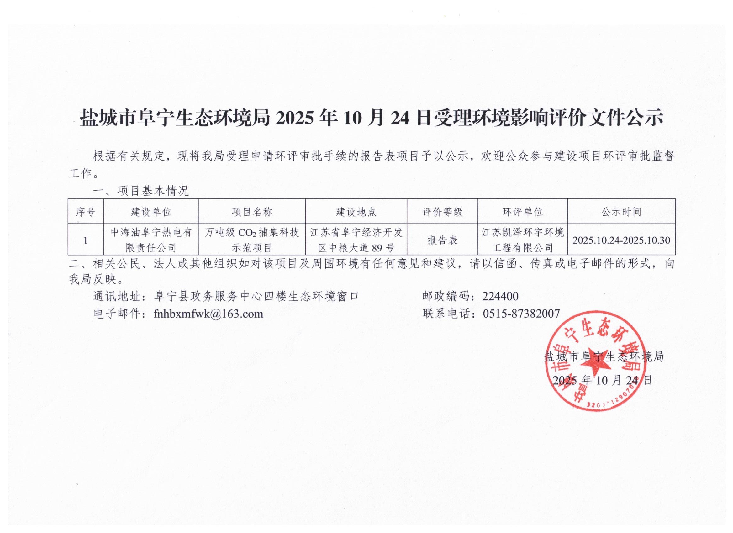 盐城市阜宁生态环境局2025年10月24日受理环境影响评价文件公示