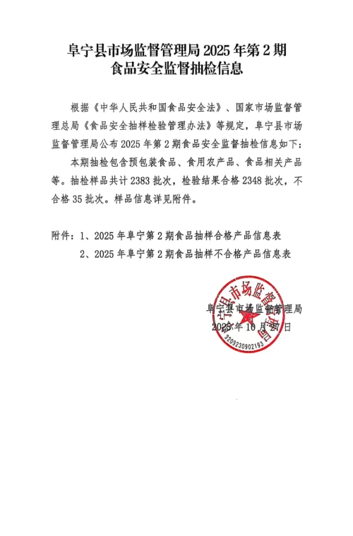 阜宁县市场监督管理局2025年第2期食品安全监督抽检信息