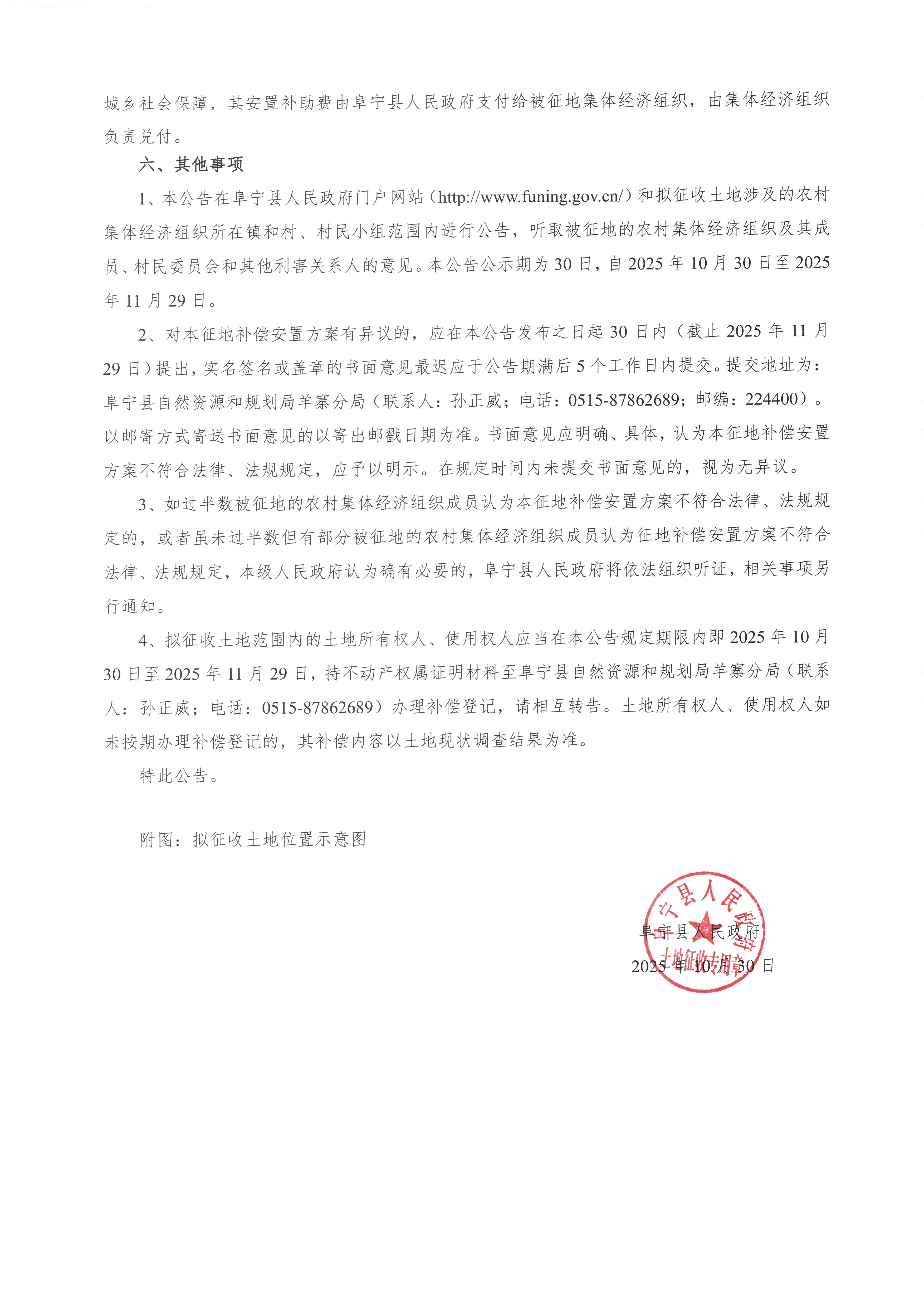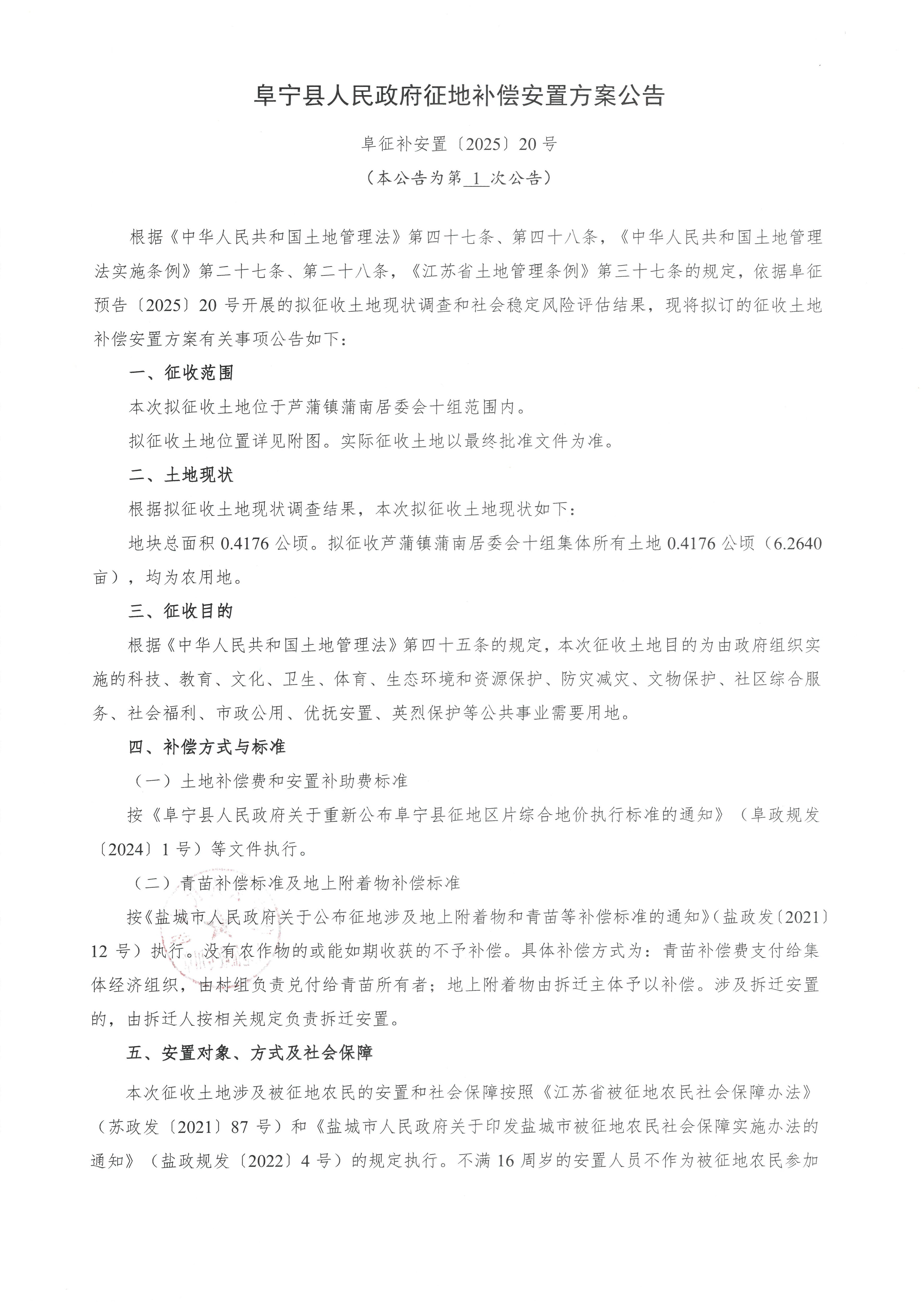 阜宁县人民政府征地补偿安置方案公告(阜征补安置〔2025〕20号)