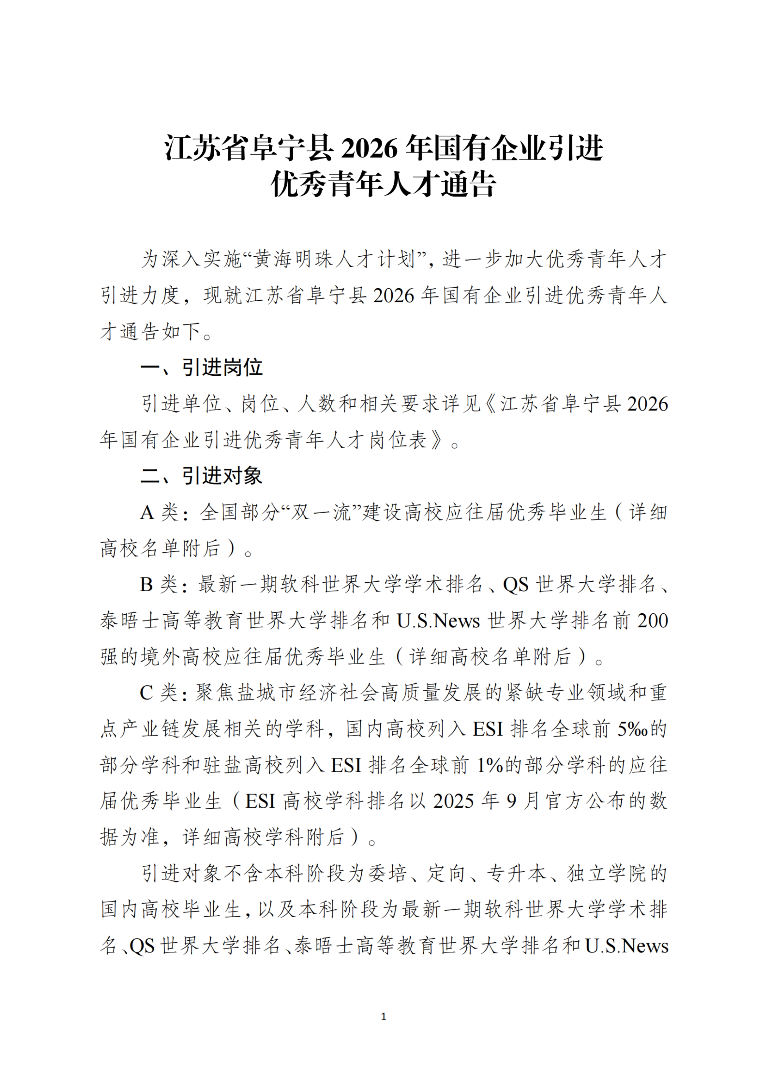 江苏省阜宁县2026年国有企业引进优秀青年人才通告