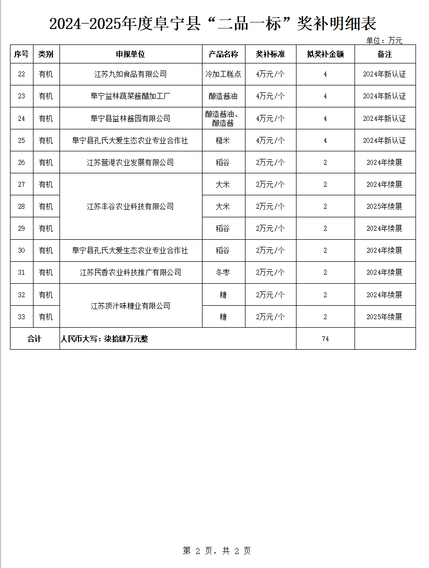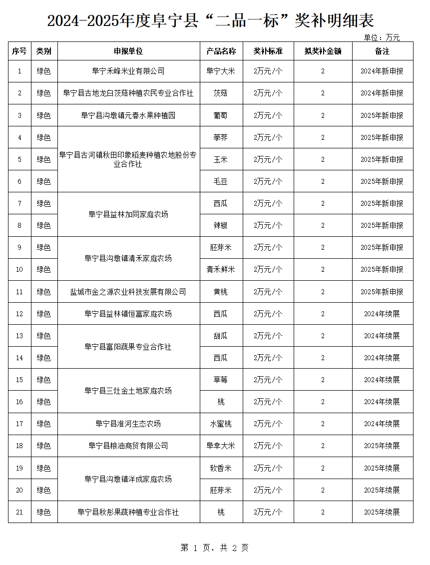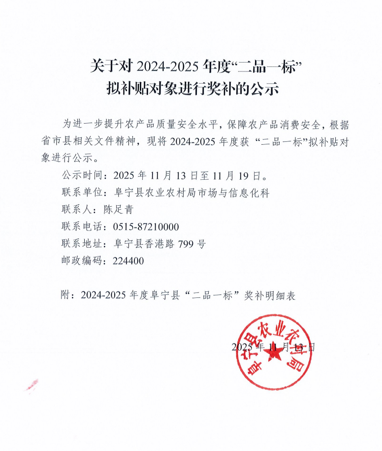 关于对2024-2025年度“二品一标”拟补贴对象进行奖补的公示