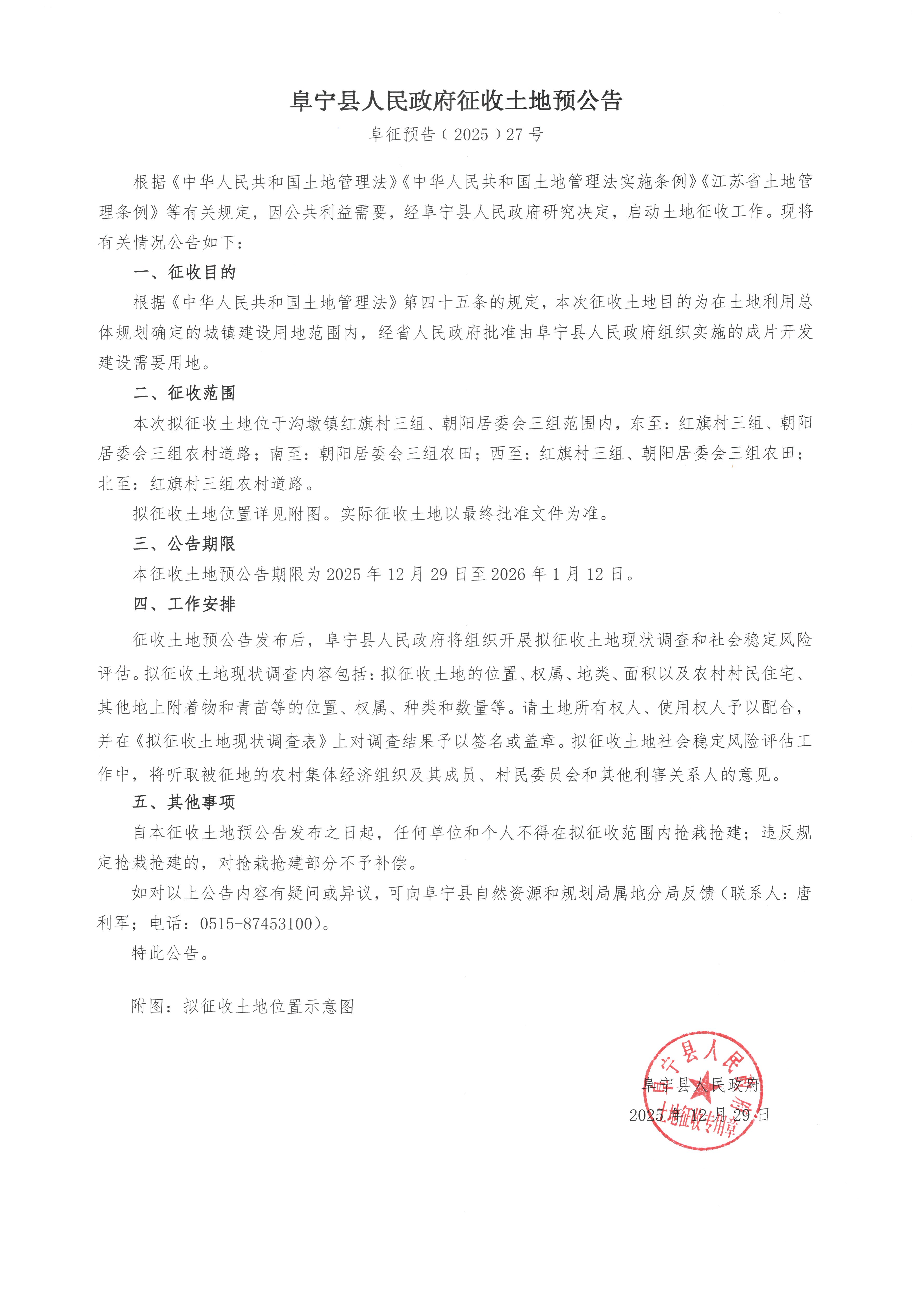 阜宁县人民政府征收土地预公告(阜征预告〔2025〕27号)