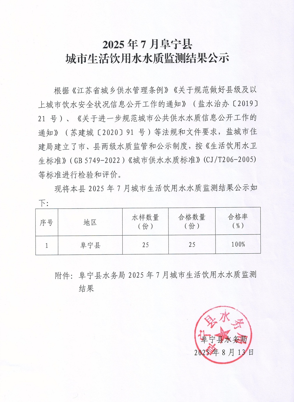 2025年7月阜宁县城市生活饮用水水质监测结果公示