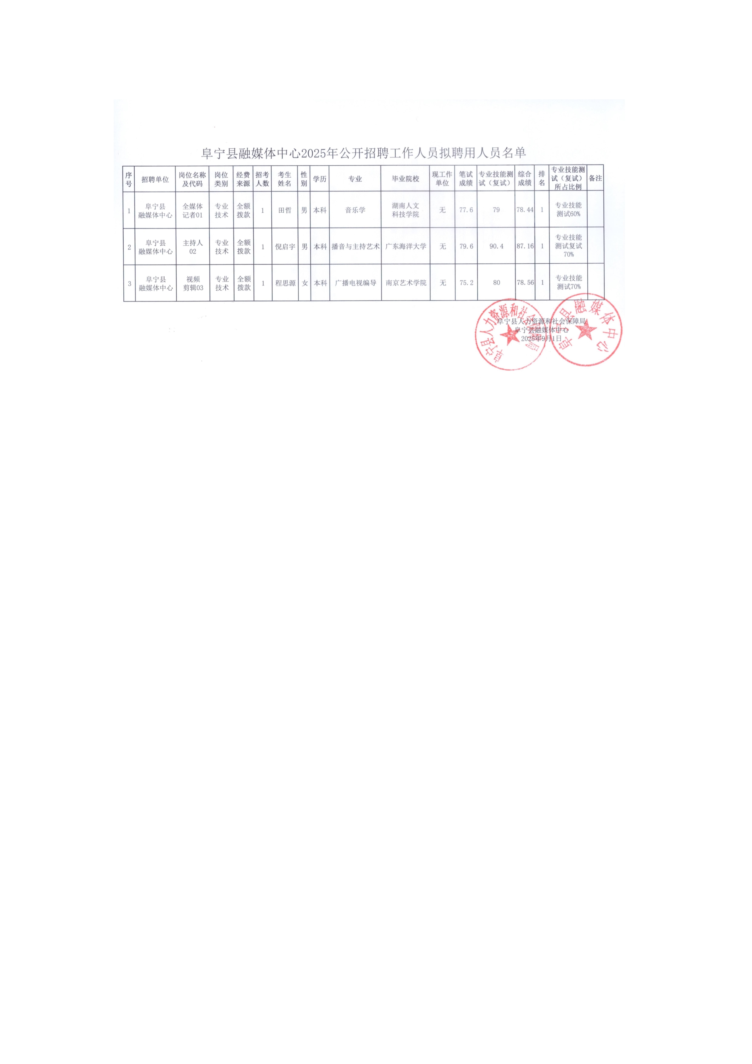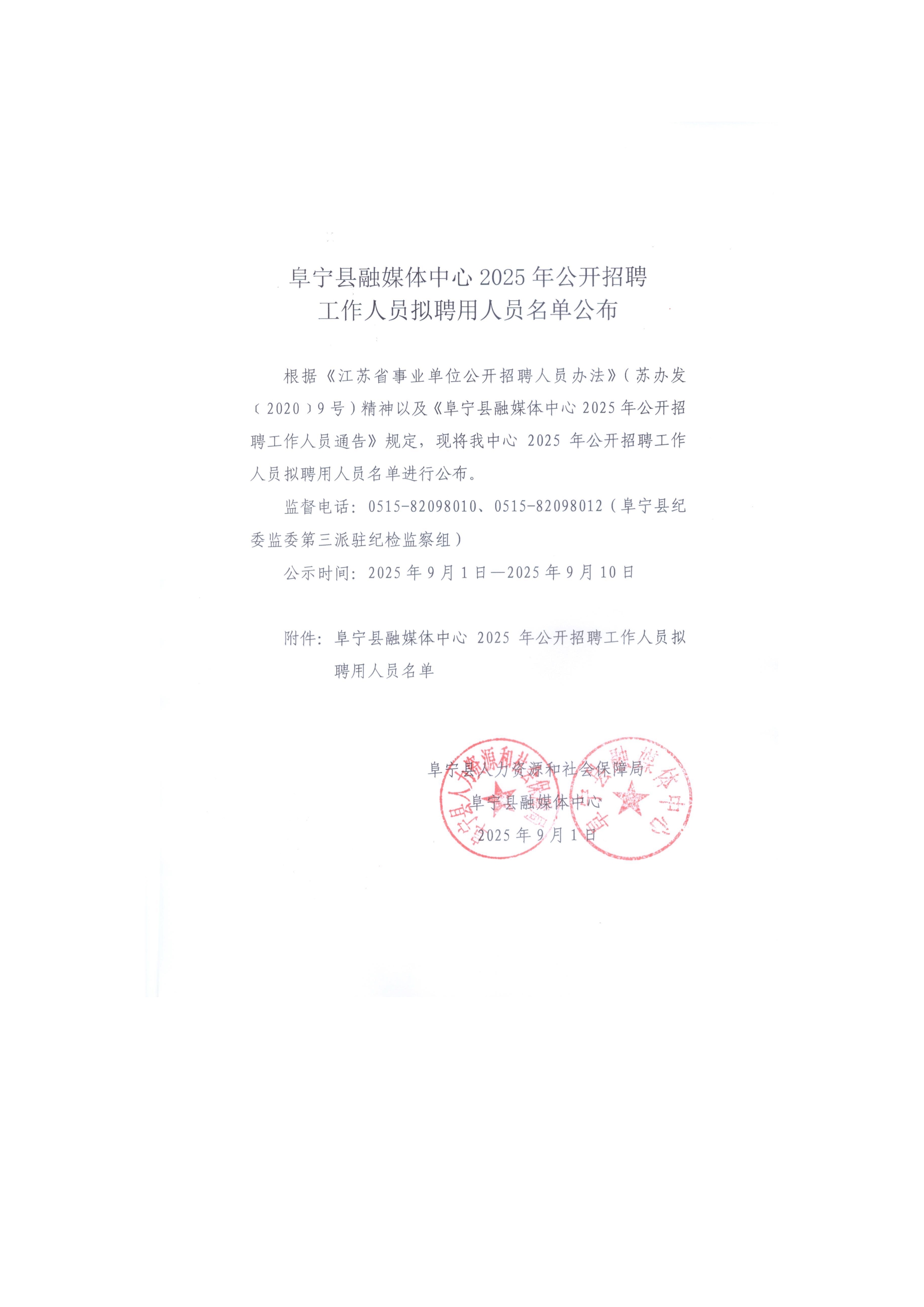 阜宁县融媒体中心2025年公开招聘工作人员拟聘用人员名单