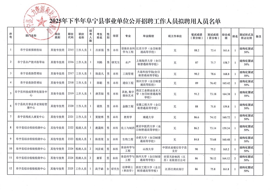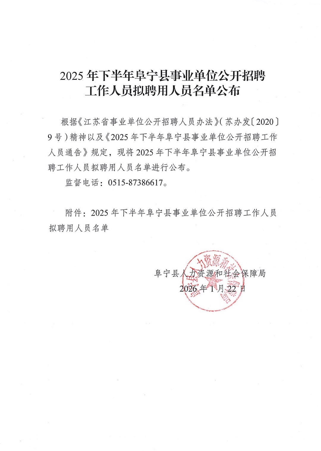2025年下半年阜宁县事业单位公开招聘工作人员拟聘用人员名单公布