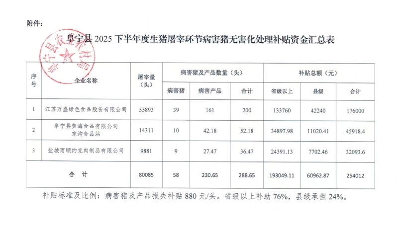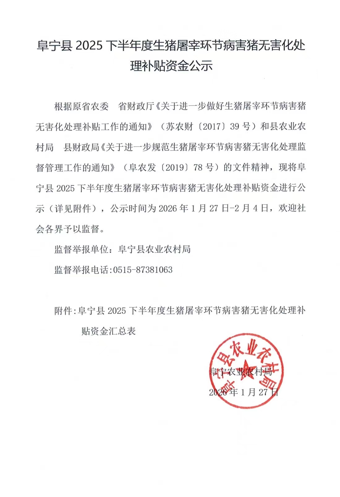 阜宁县2025下半年度生猪屠宰环节病害猪无害化处理补贴资金公示