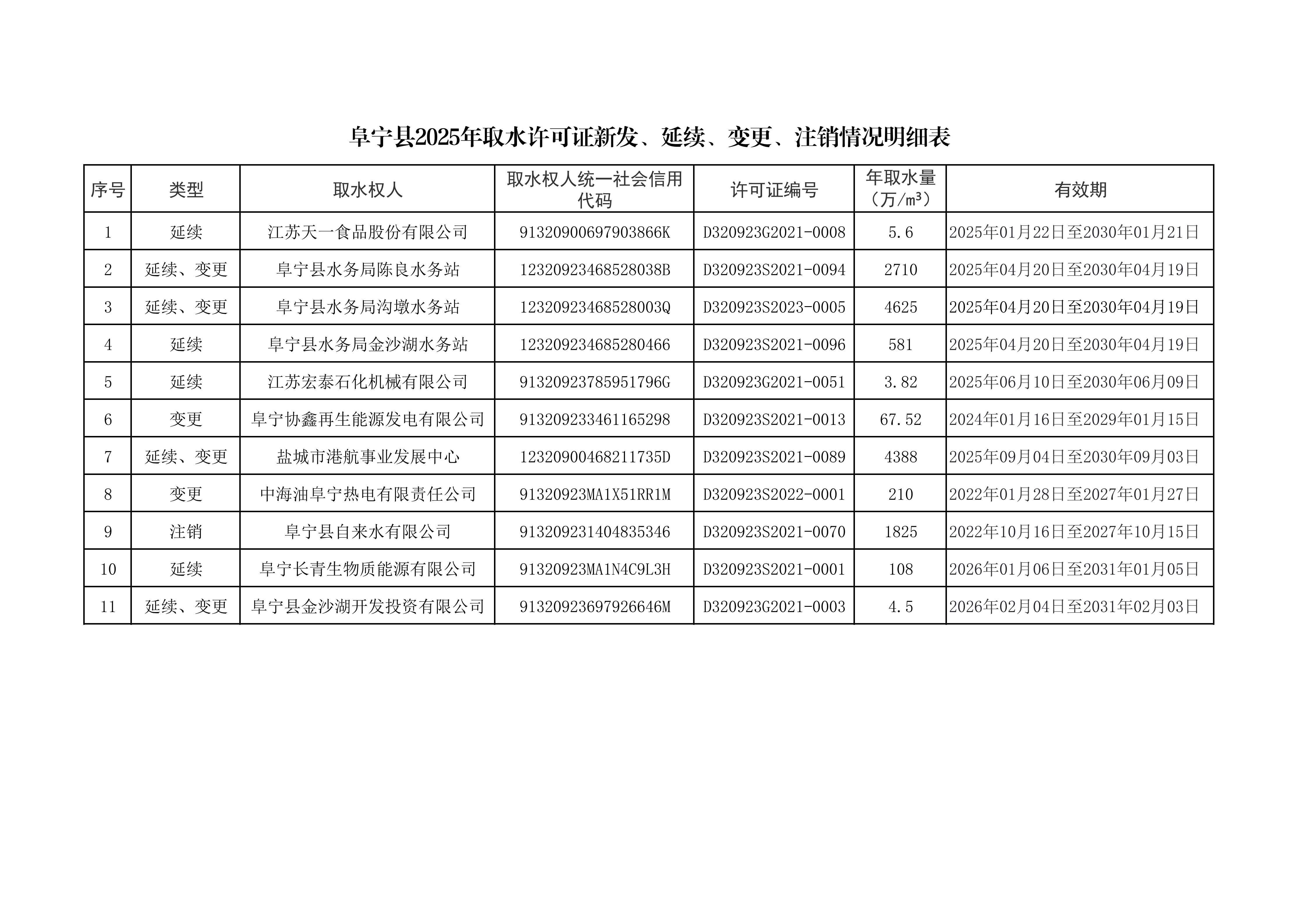 附件:阜宁县2025年度取水许可证新发、延续、变更、注销情况明细表
