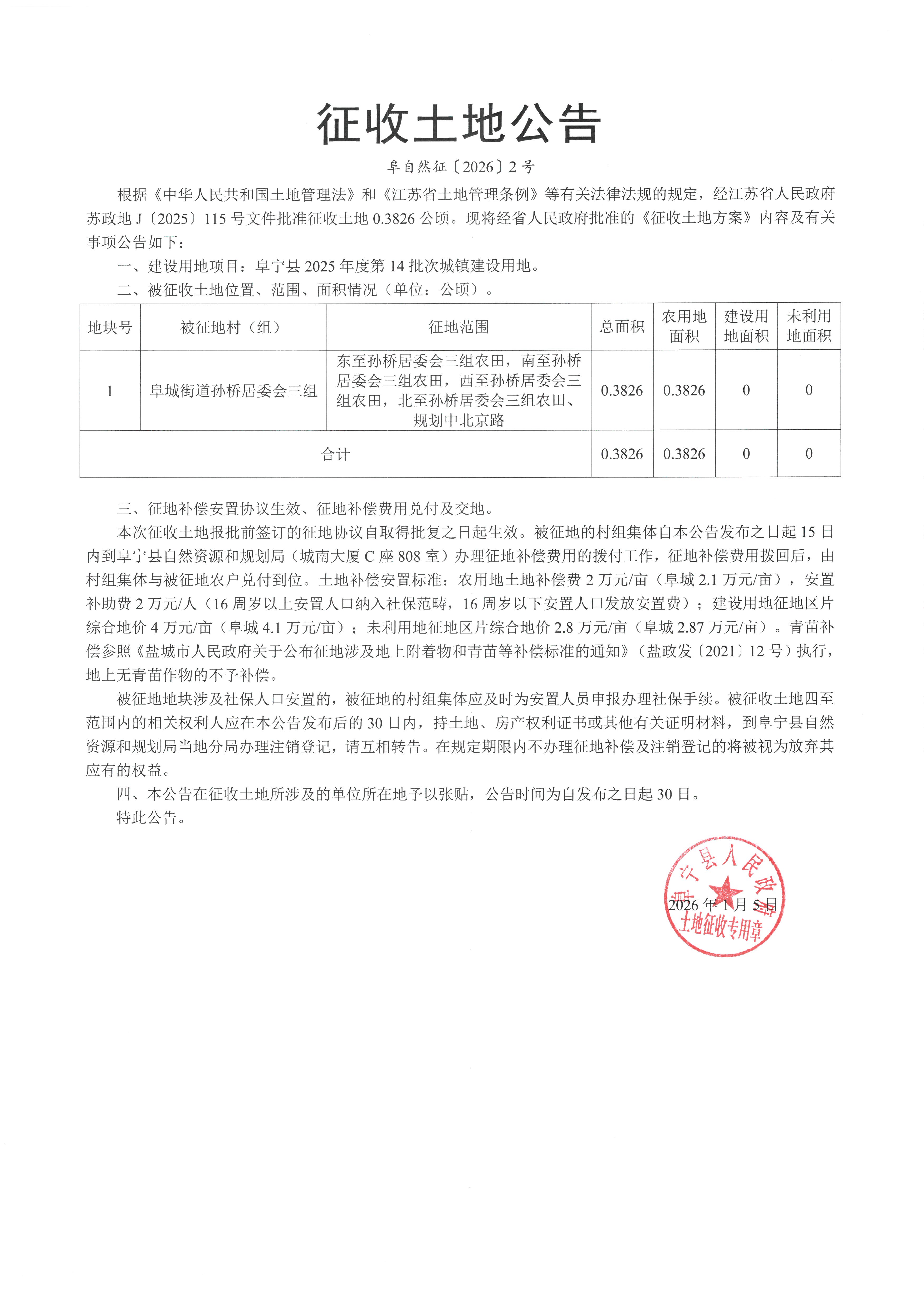 征收土地公告(阜自然征〔2026〕2号)