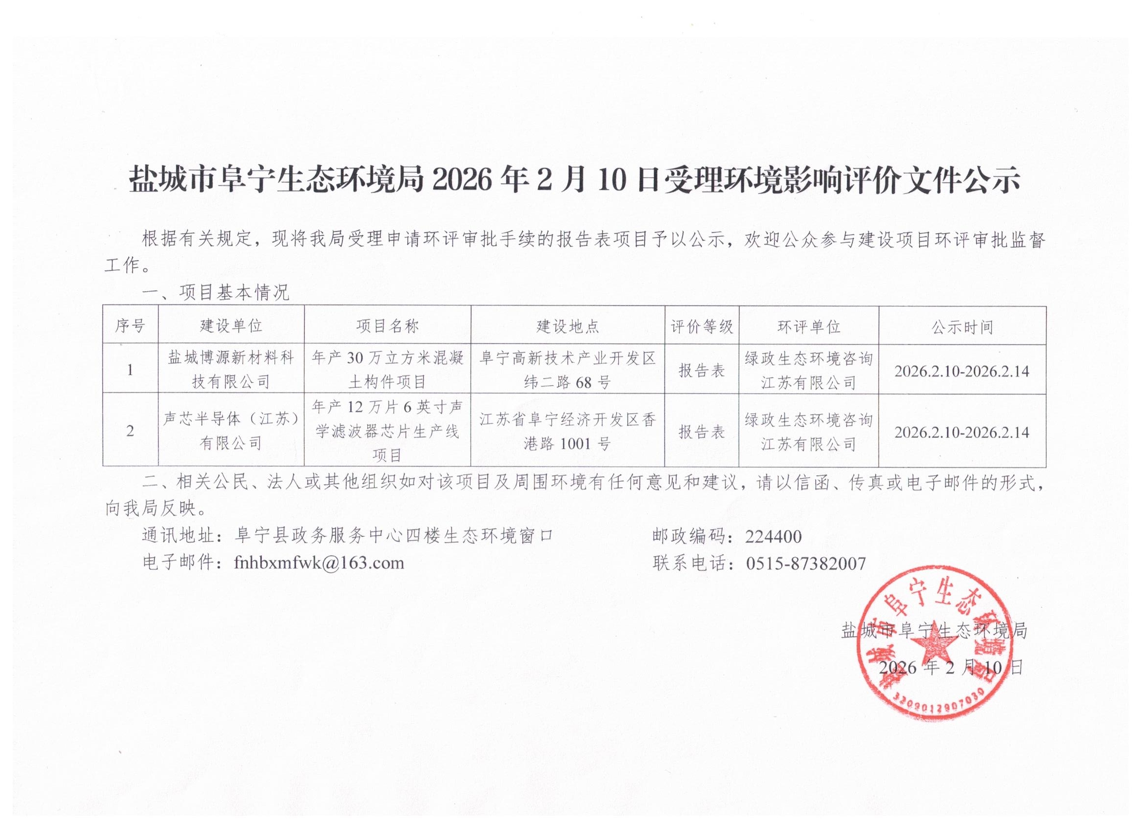 盐城市阜宁生态环境局2026年2月10日受理环境影响评价文件公示
