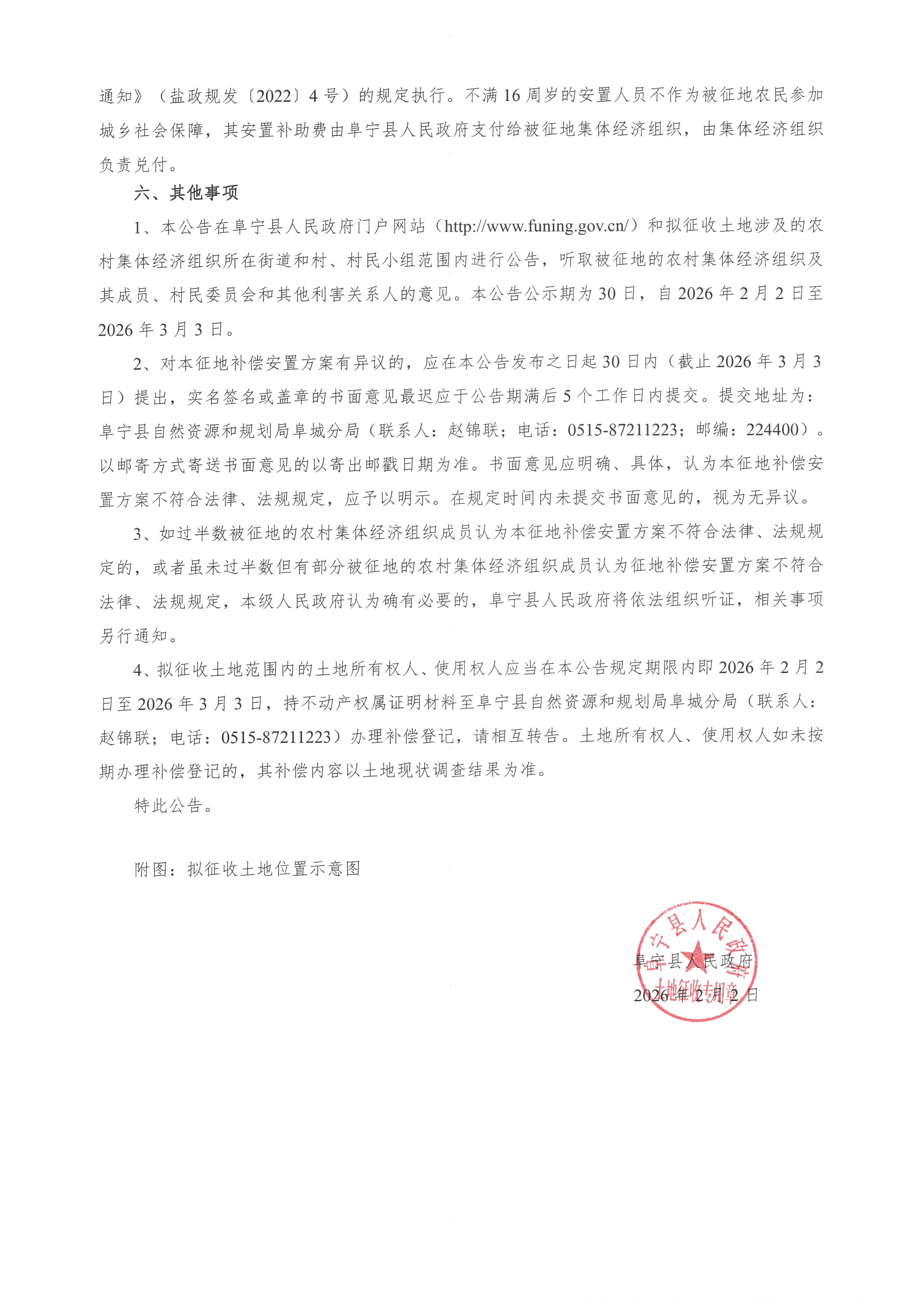 阜宁县人民政府征地补偿安置方案公告(阜征补安置〔2026〕2号)