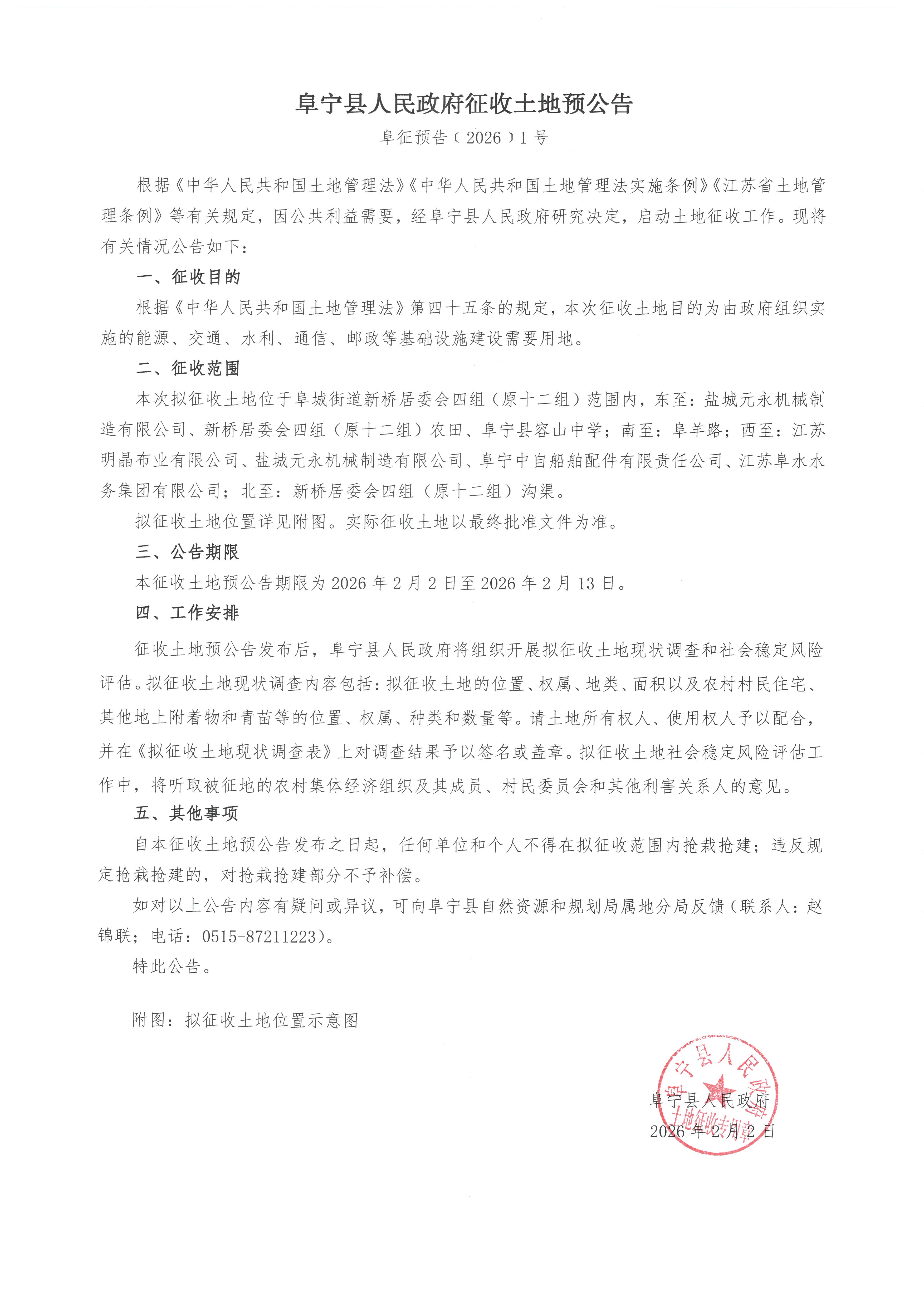 阜宁县人民政府征收土地预公告(阜征预告〔2026〕1号)