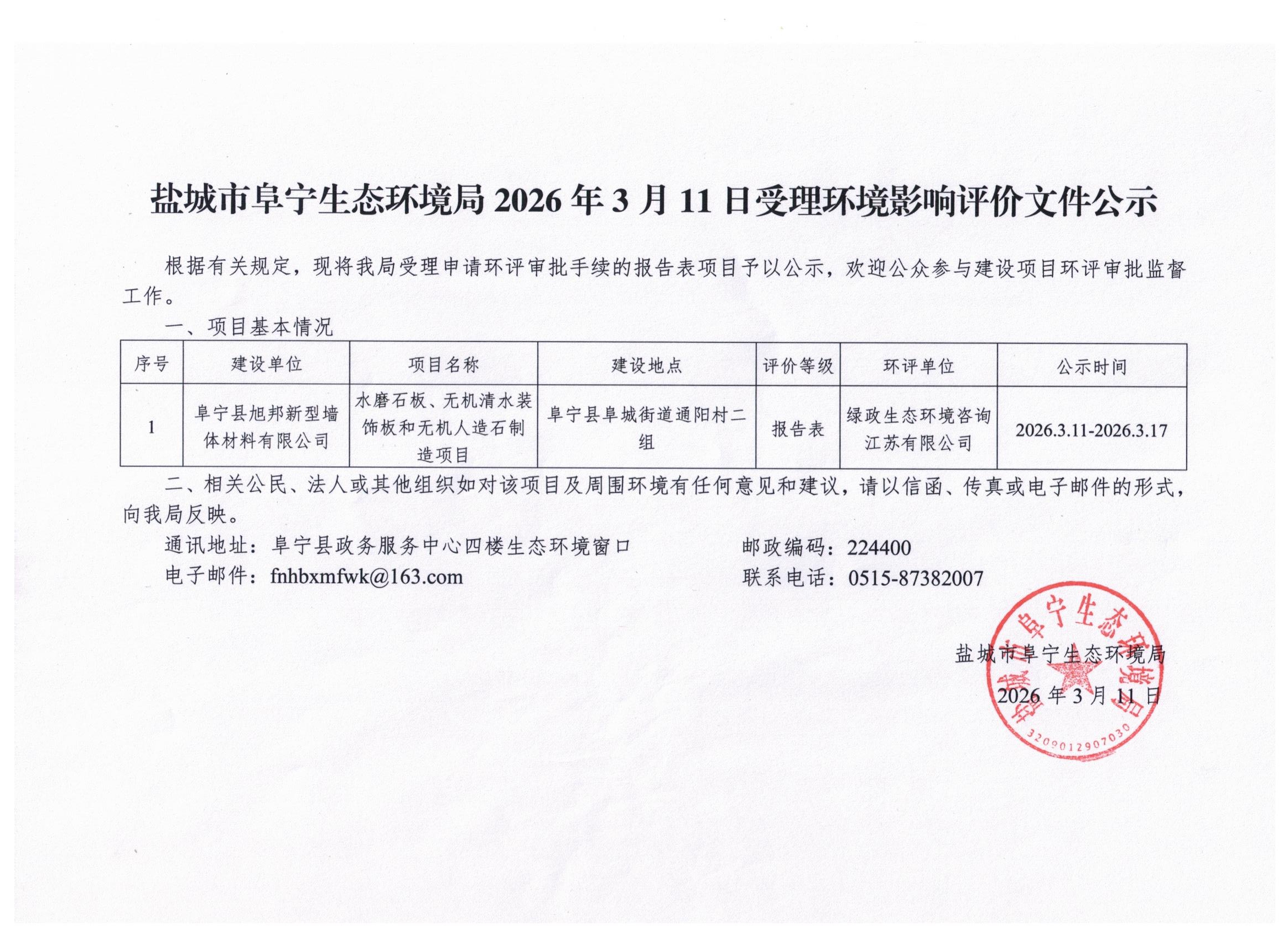 盐城市阜宁生态环境局2026年3月11日受理环境影响评价文件公示