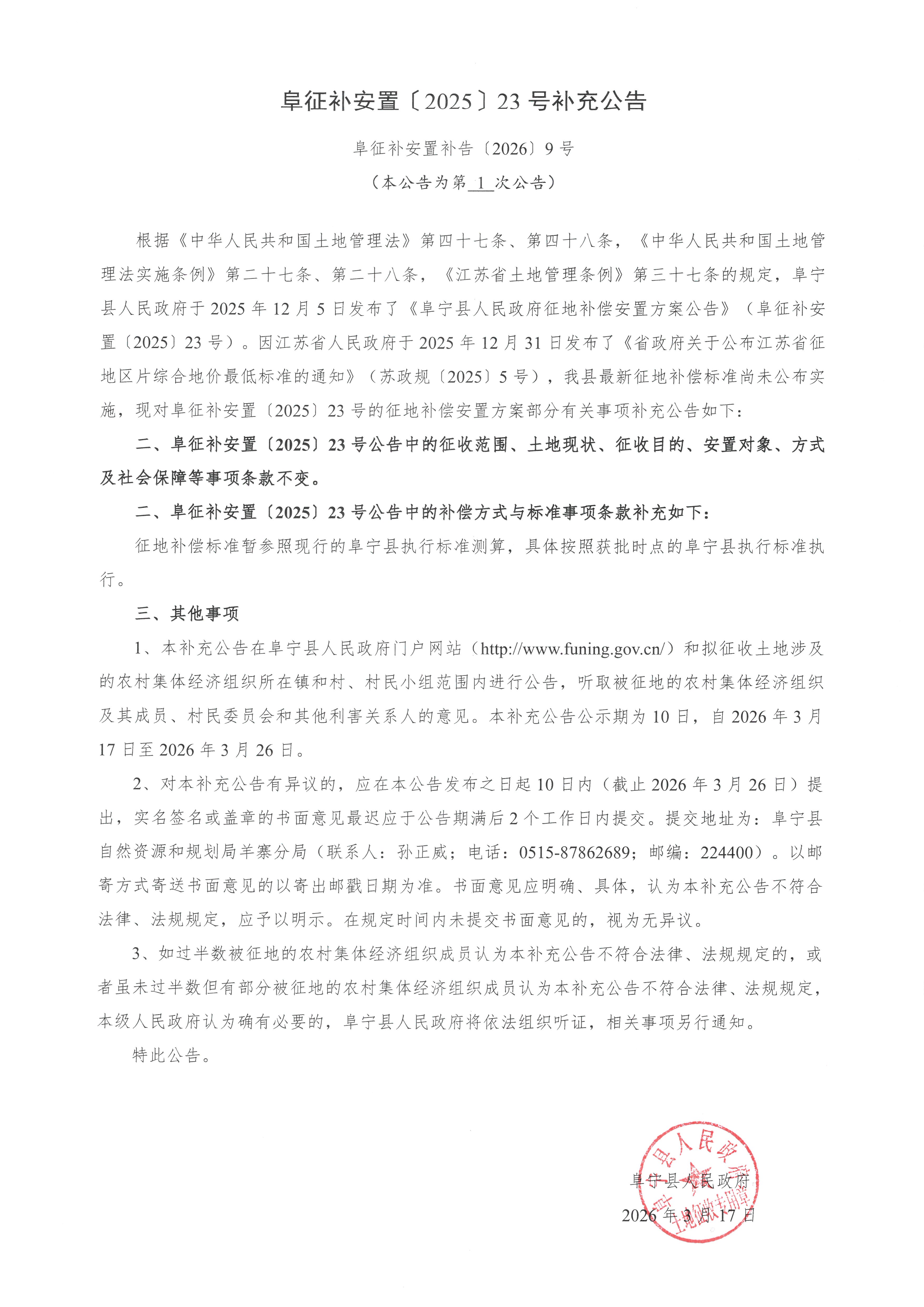 阜征补安置〔2025〕23号补充公告(阜征补安置补告〔2026〕9号)