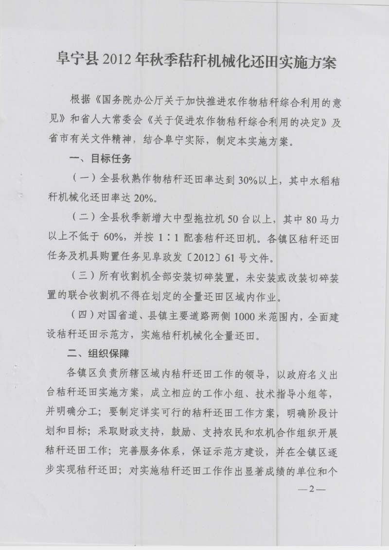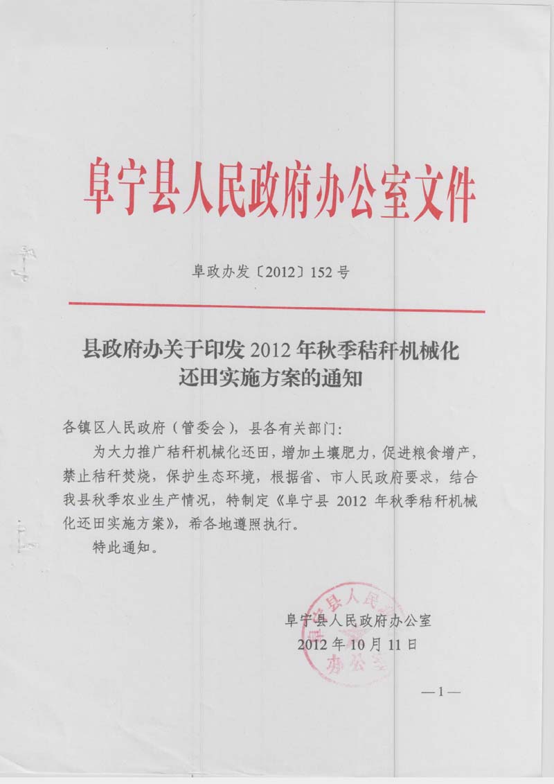 县政府办关于印发2012年秋季秸秆机械化还田实施方案的通知