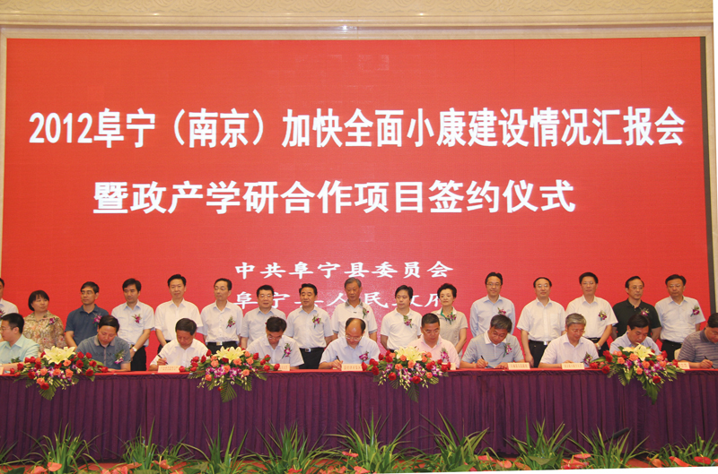 阜宁在宁举办全面小康汇报会。图为政产学研合作项目签约现场。