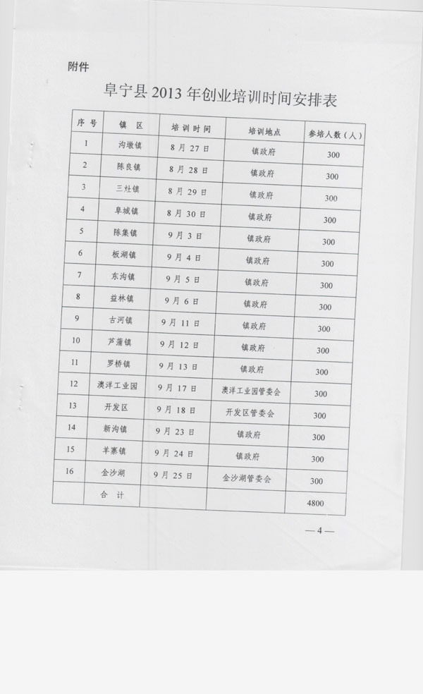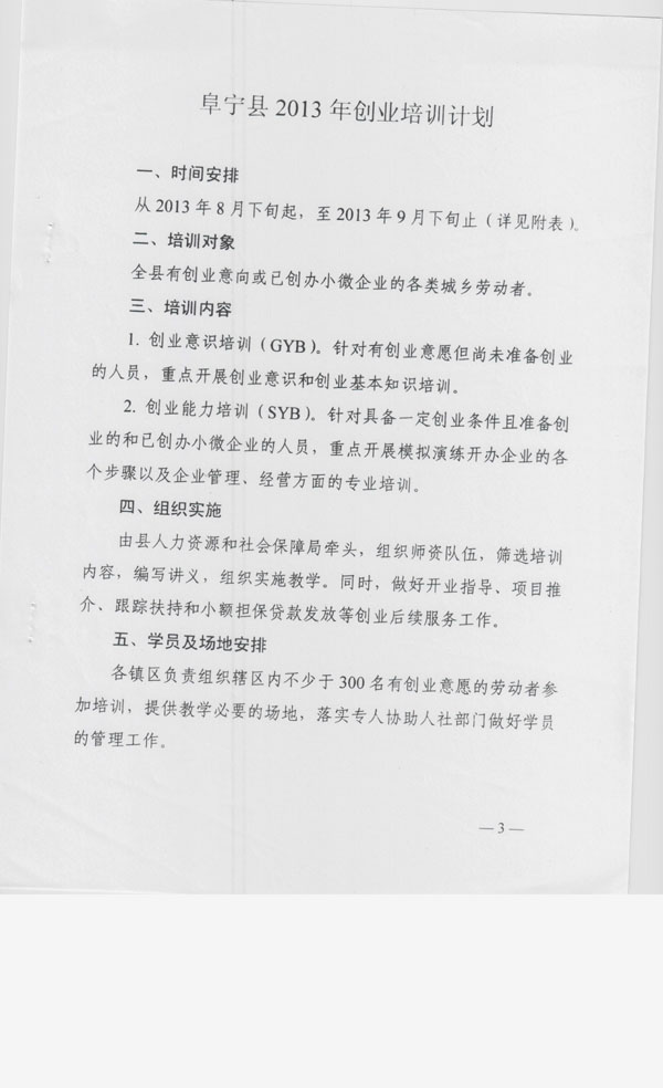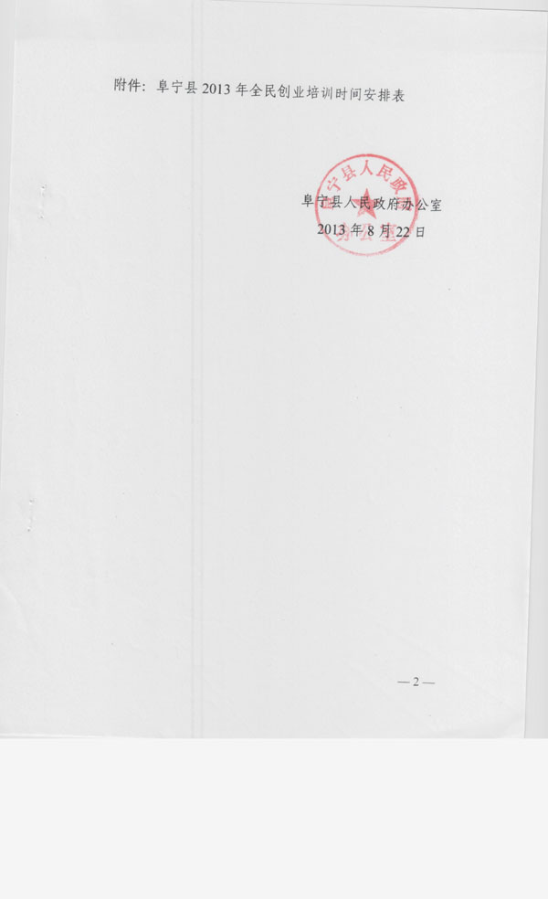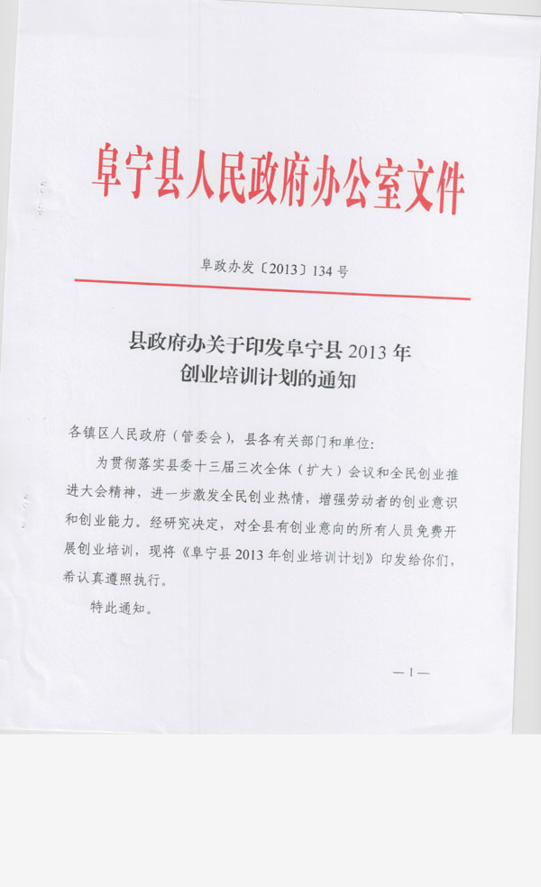 县政府办关于印发阜宁县2013年创业培训计划的通知