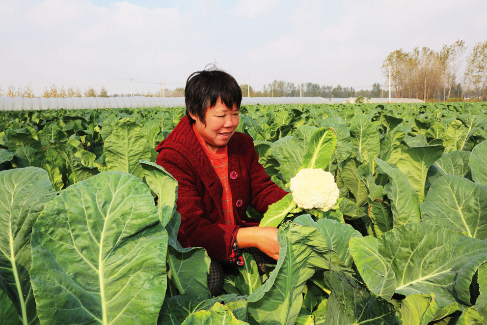 陈集镇闸东村瞄准市场消费需求,大力发展蔬菜种植产业。图为11月10日种植户正在采收花菜。