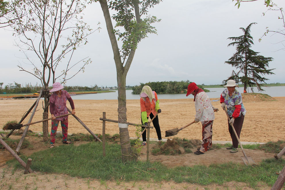 金沙湖景区对草坪进行保养处理。