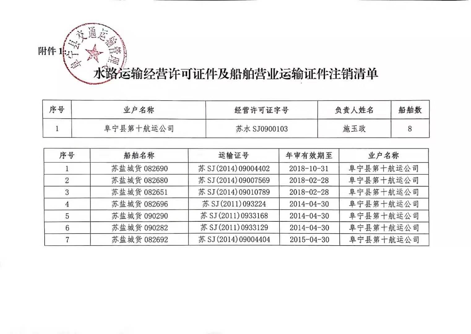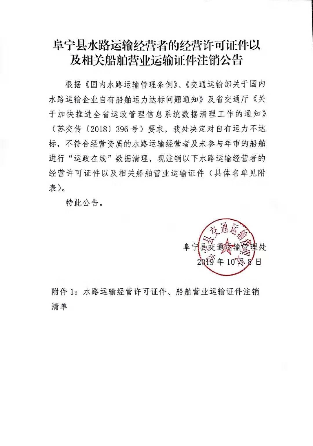 阜宁县水路运输经营者的经营许可证件以及相关船舶营业运输证件注销通告