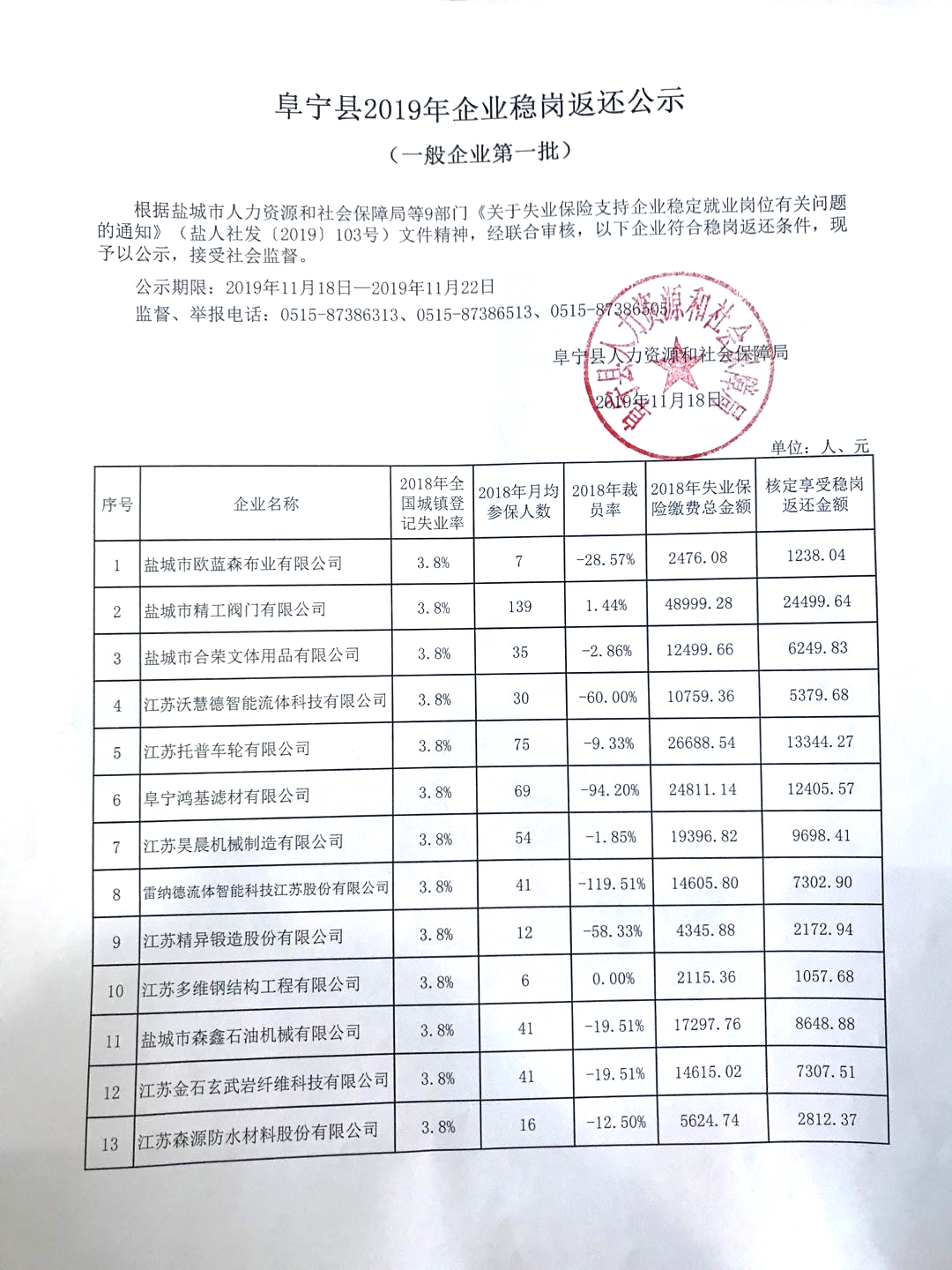 2019年稳岗返还公示(第一批一般企业)