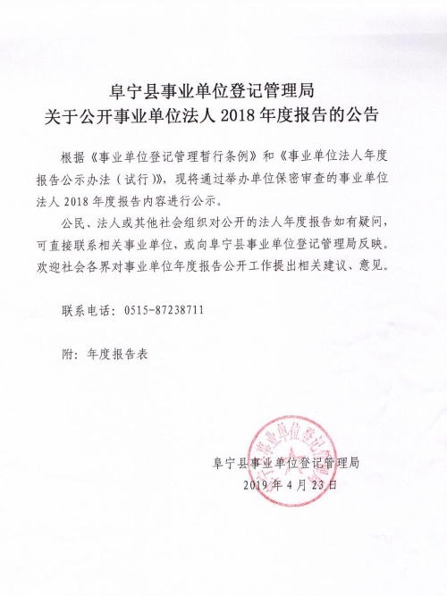 阜宁县事业单位登记管理局关于公开事业单位法人2018年度报告的公告