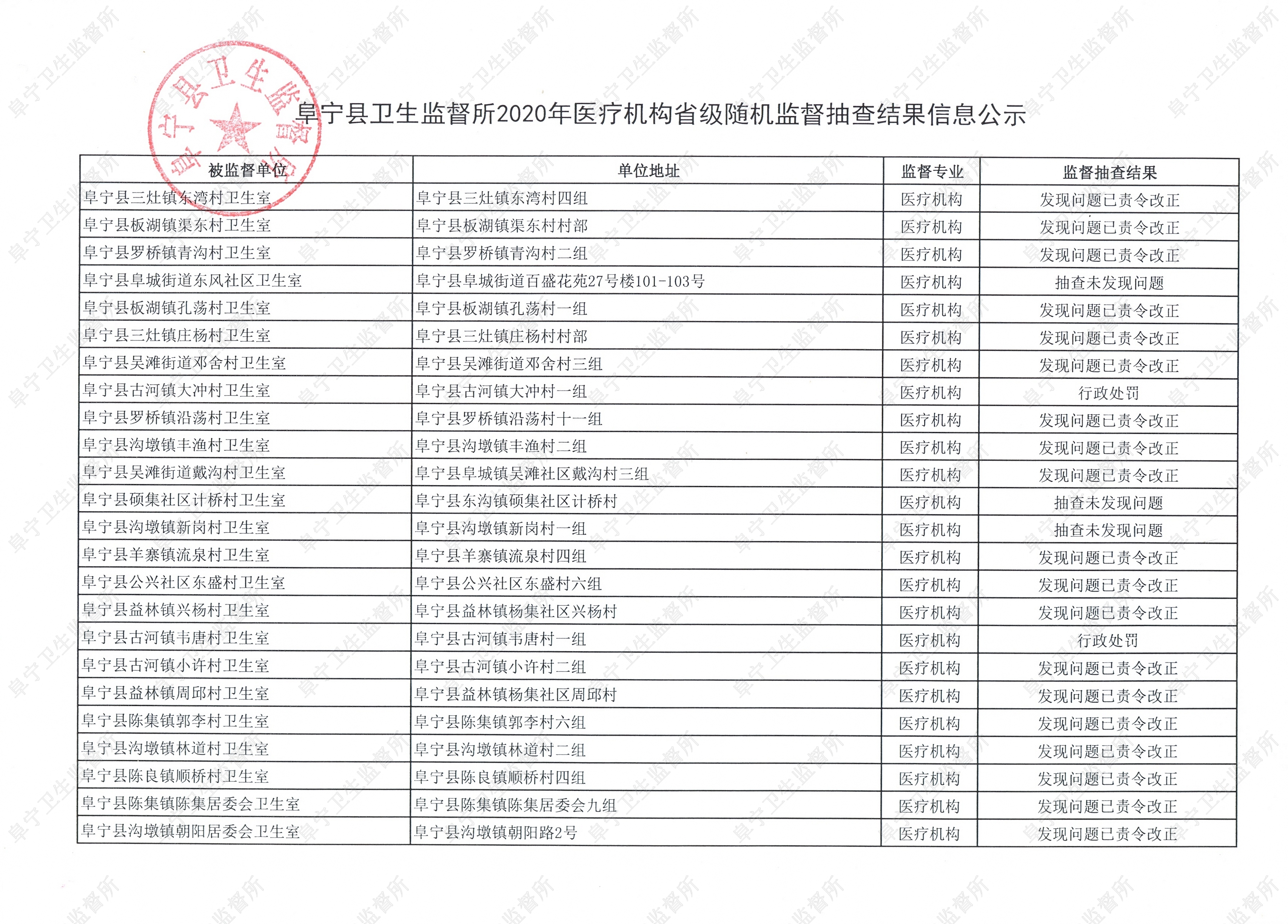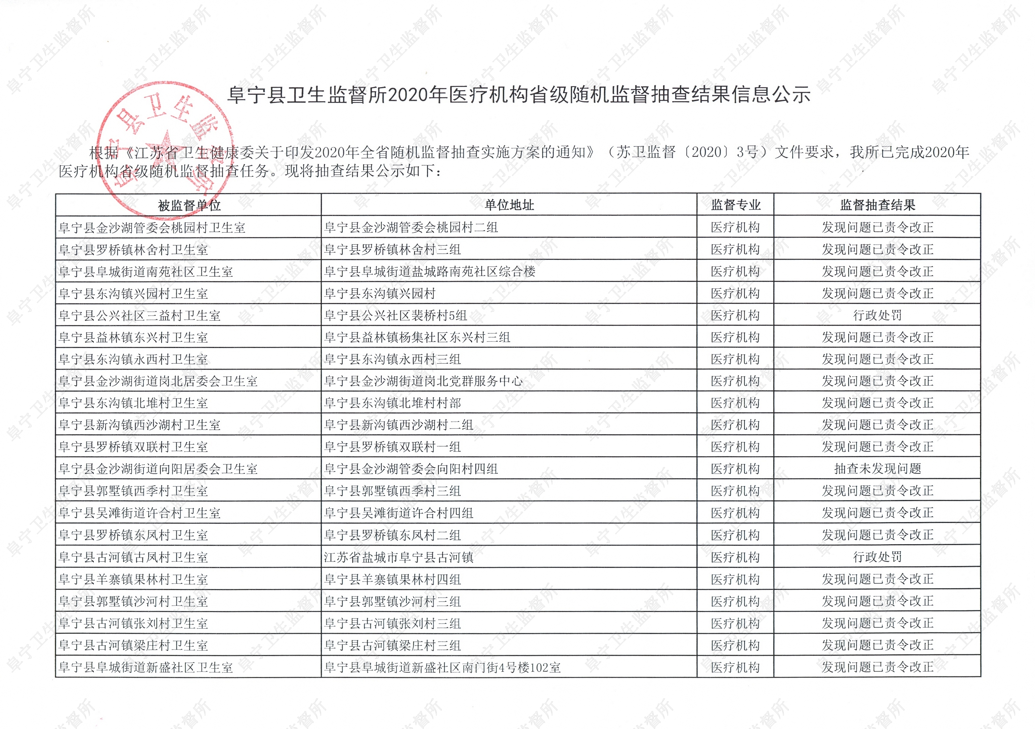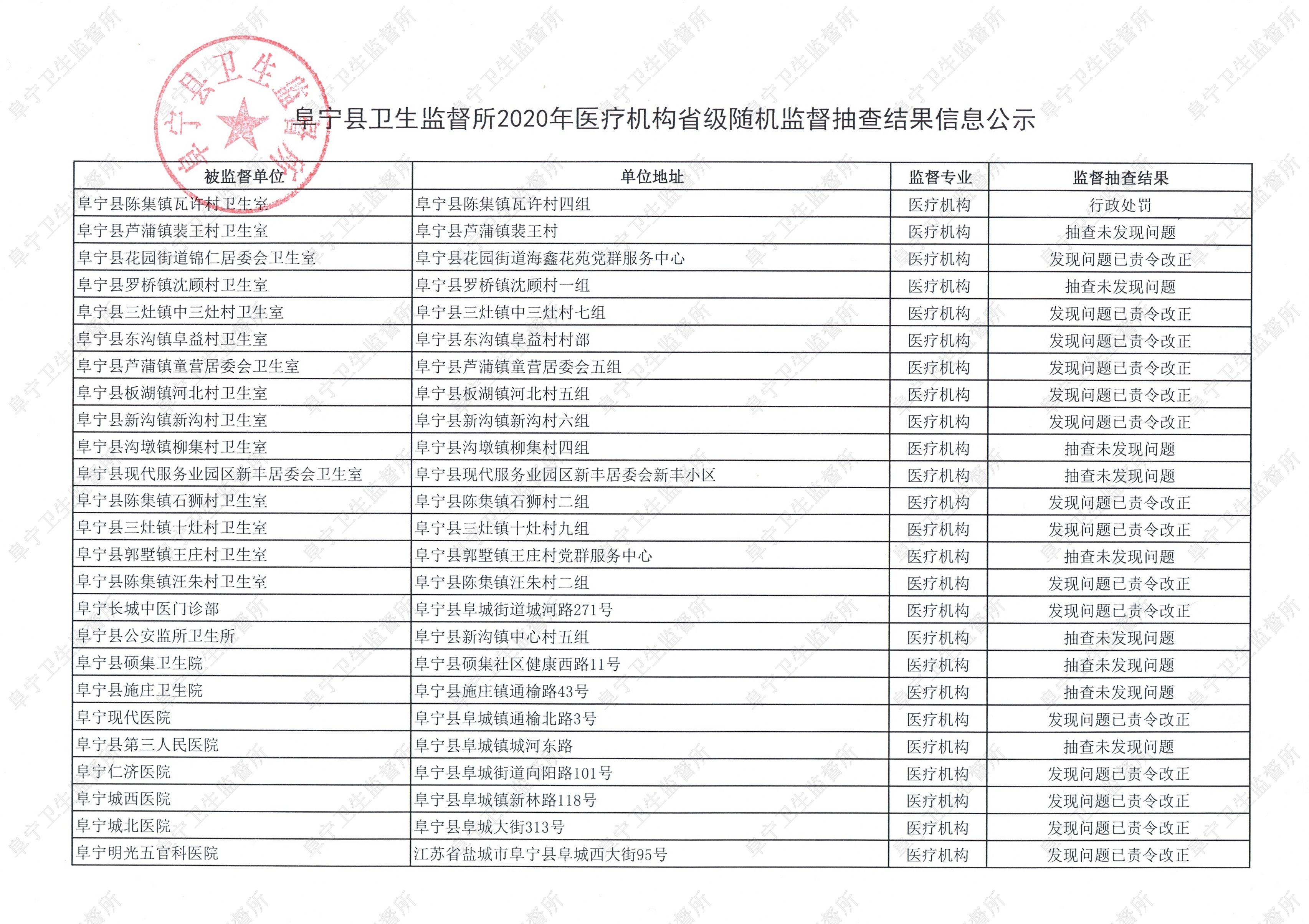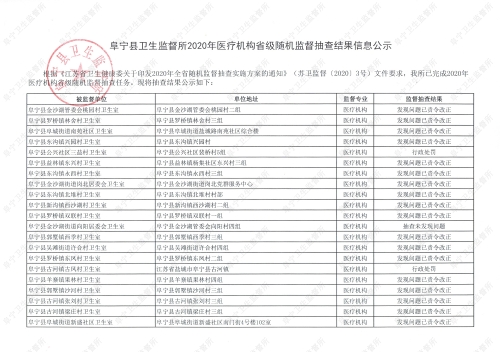阜宁县卫生监督所2020年医疗机构省级随机监督抽查结果信息公示