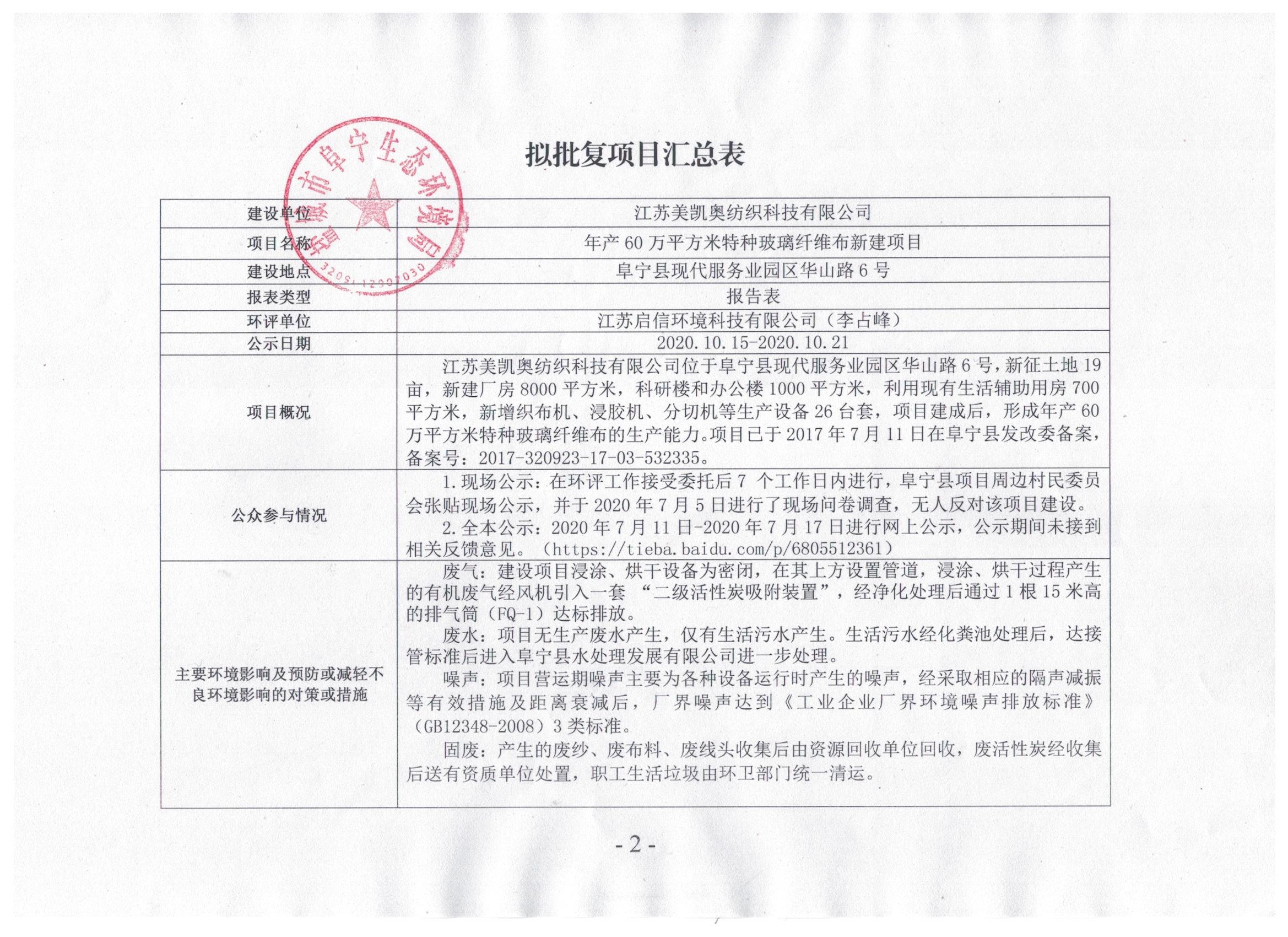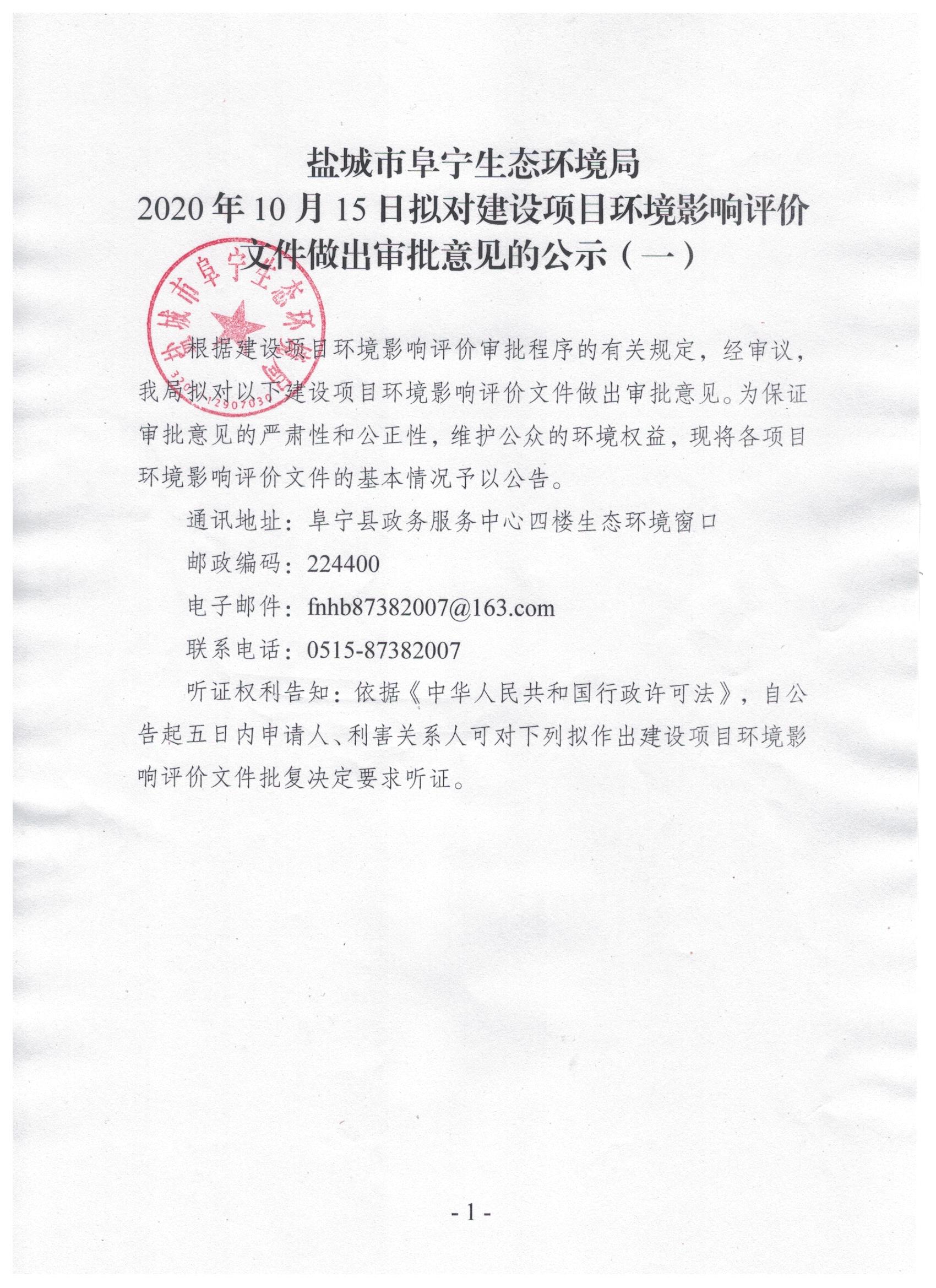盐城市阜宁生态环境局2020年10月15日拟对建设项目环境影响评价文件做出审批意见的公示(一)