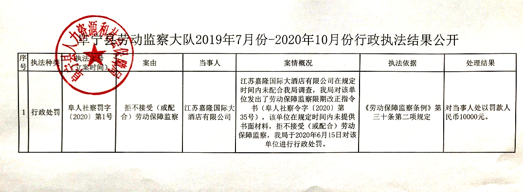 阜宁县劳动监察大队2019年7月份-2020年10月份行政执法结果公开