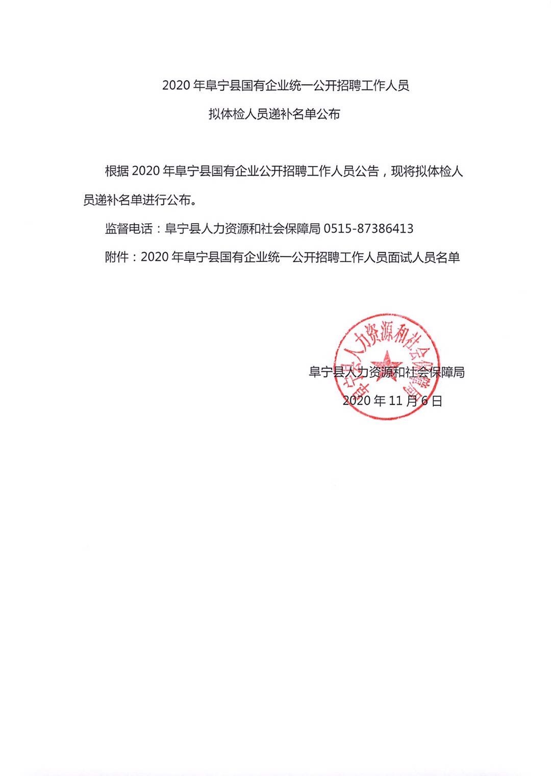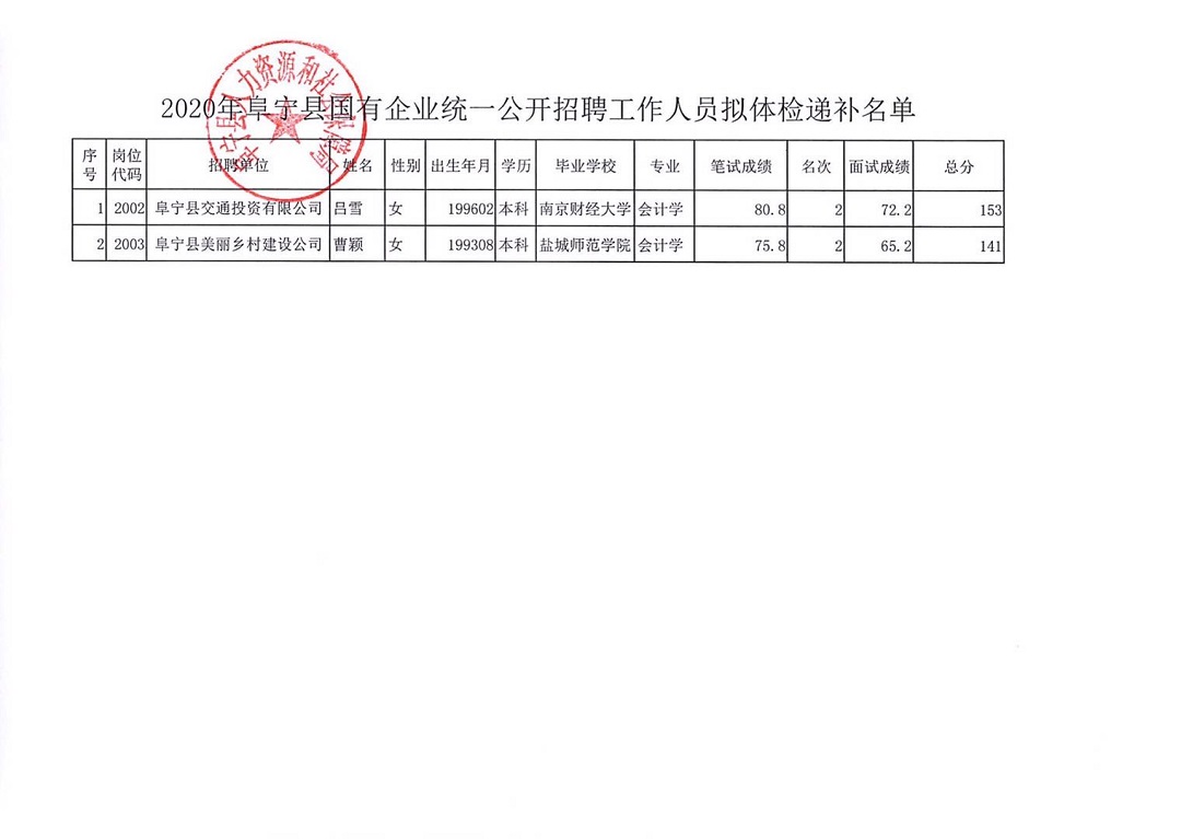 2020年阜宁县国有企业统一公开招聘工作人员拟体检人员递补名单公布