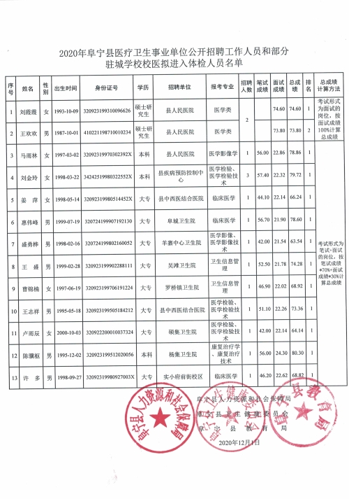 2020年江苏省阜宁县医疗卫生事业单位公开招聘工作人员和部分驻城学校校医拟进入体检人员名单