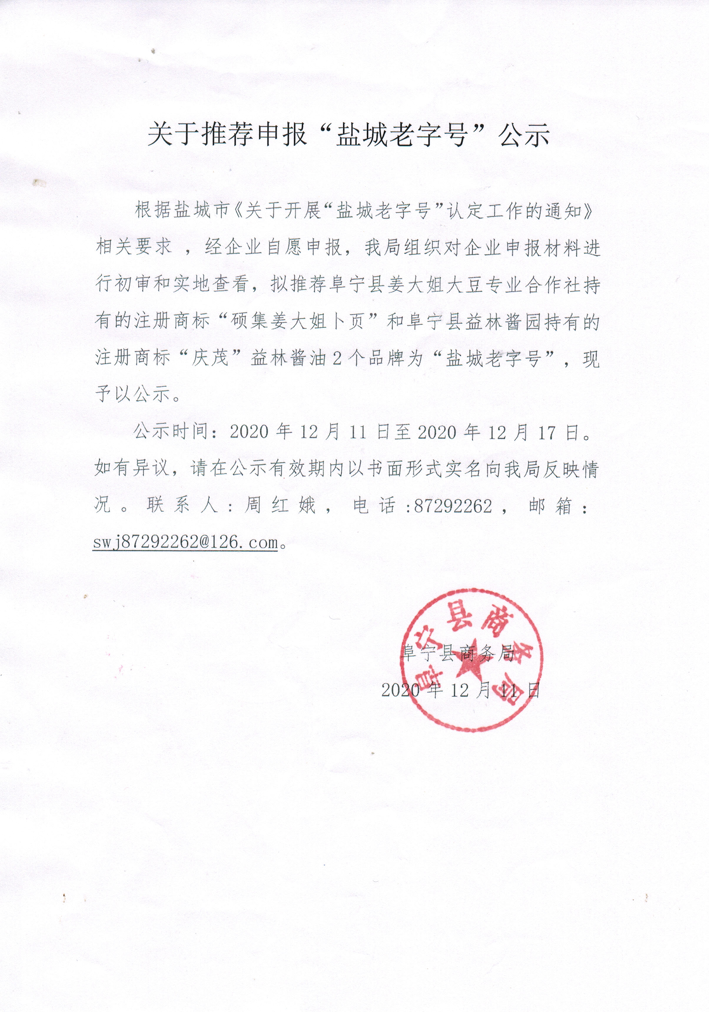 关于推荐申报“盐城老字号”公示