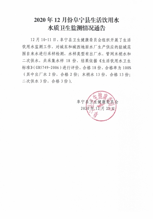 2020年12月份阜宁县生活饮用水水质卫生监测情况通告