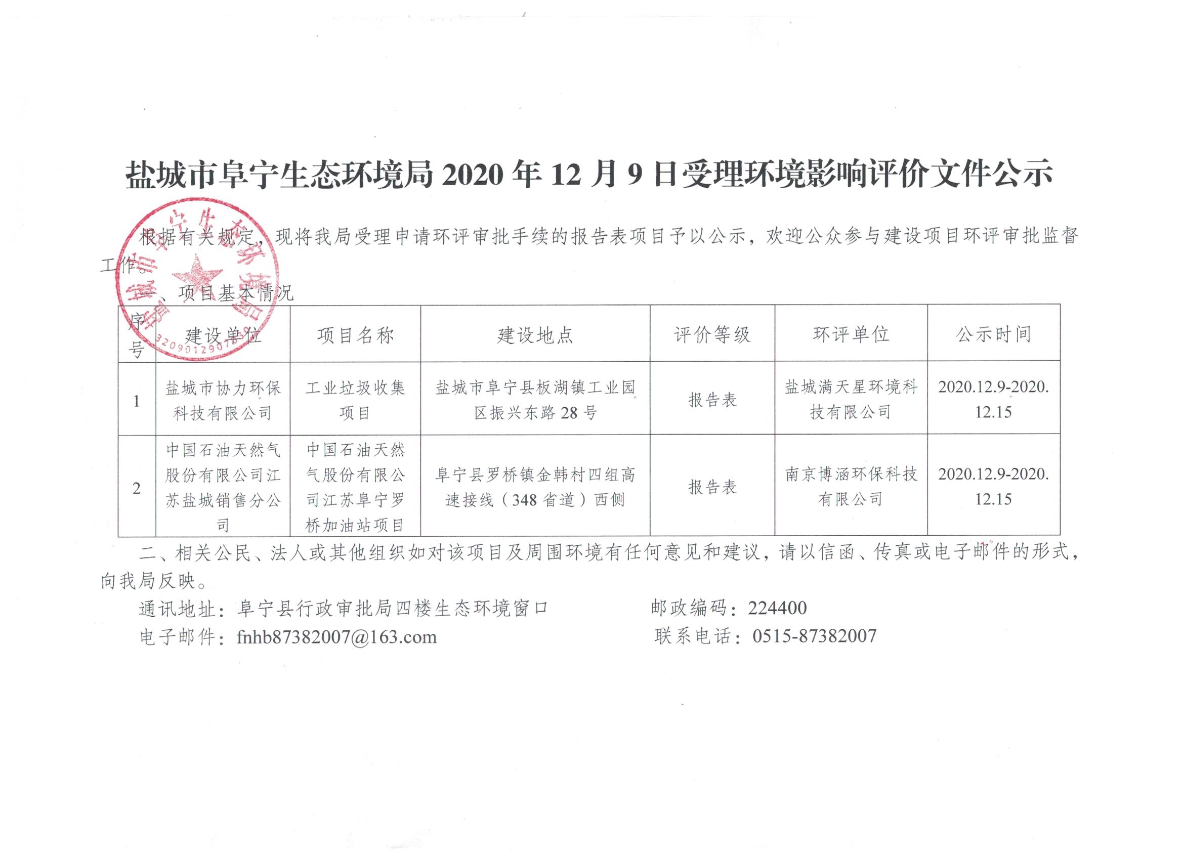 盐城市阜宁生态环境局2020年12月9日受理环境影响评价文件公示