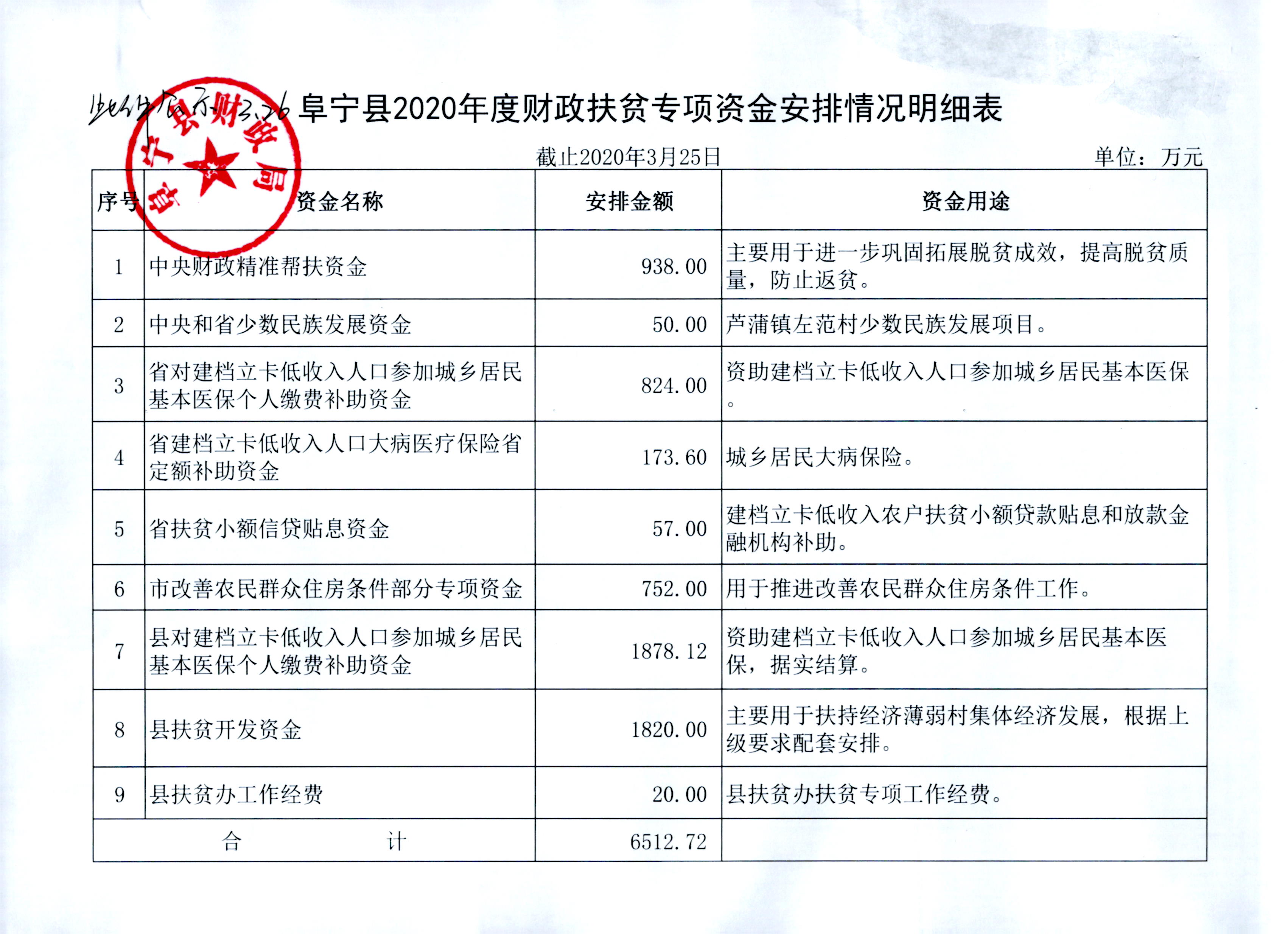 阜宁县2020年度财政扶贫专项资金安排情况明细表
