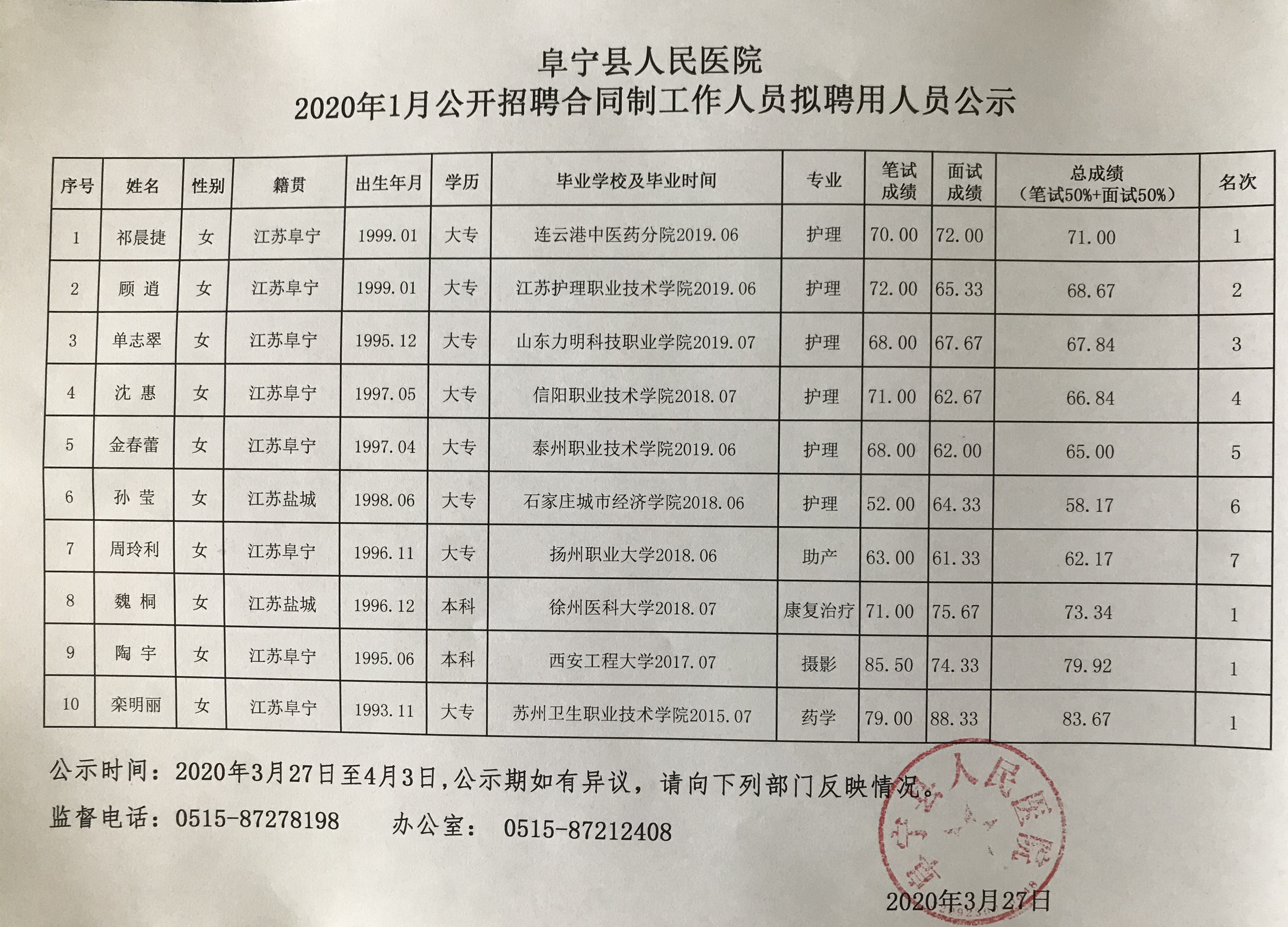 阜宁县人民医院2020年1月公开招聘合同制工作人员拟聘用人员公示