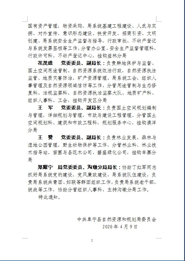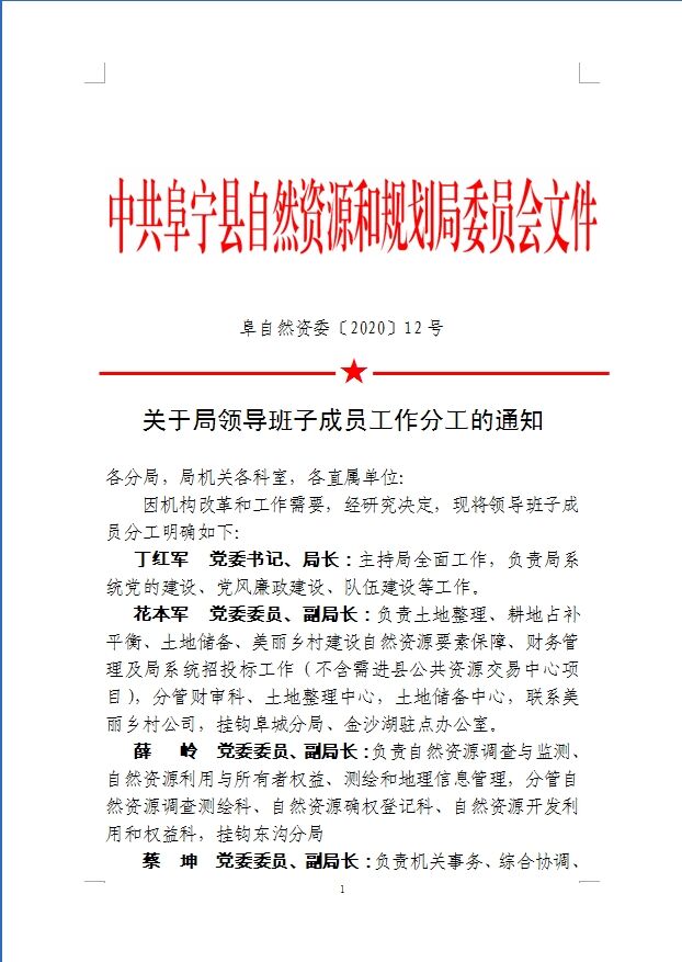 中共阜宁县自然资源和规划局委员会关于局领导班子成员工作分工的通知