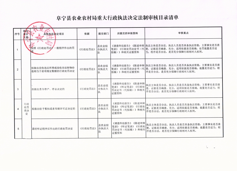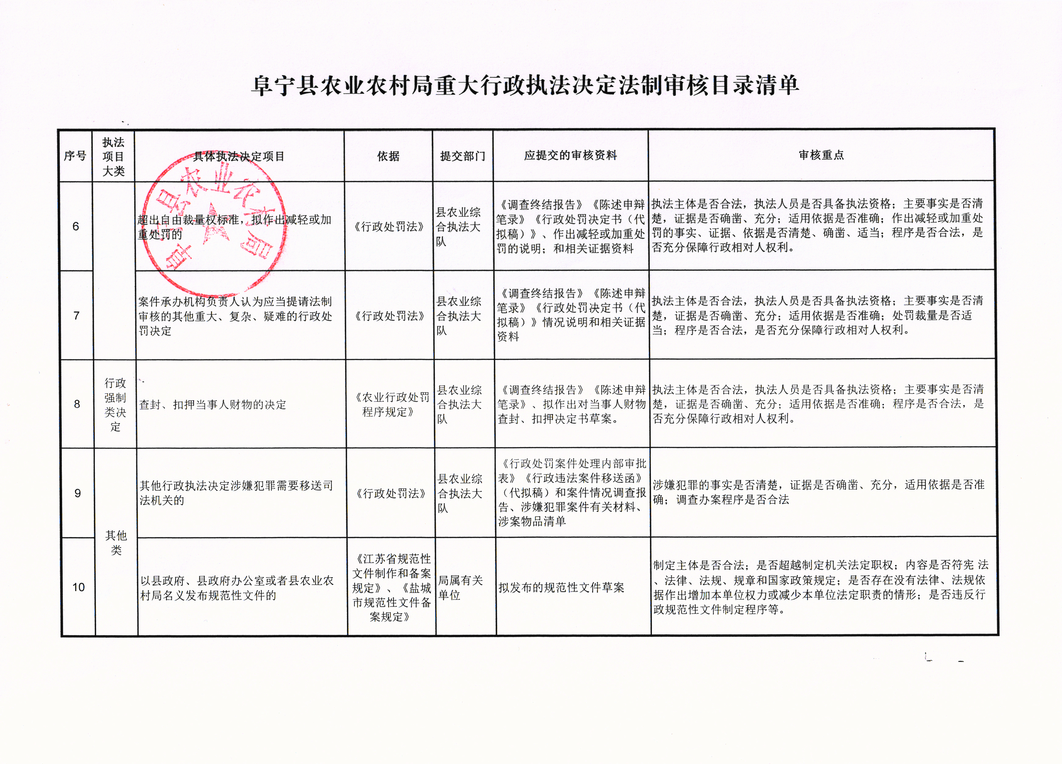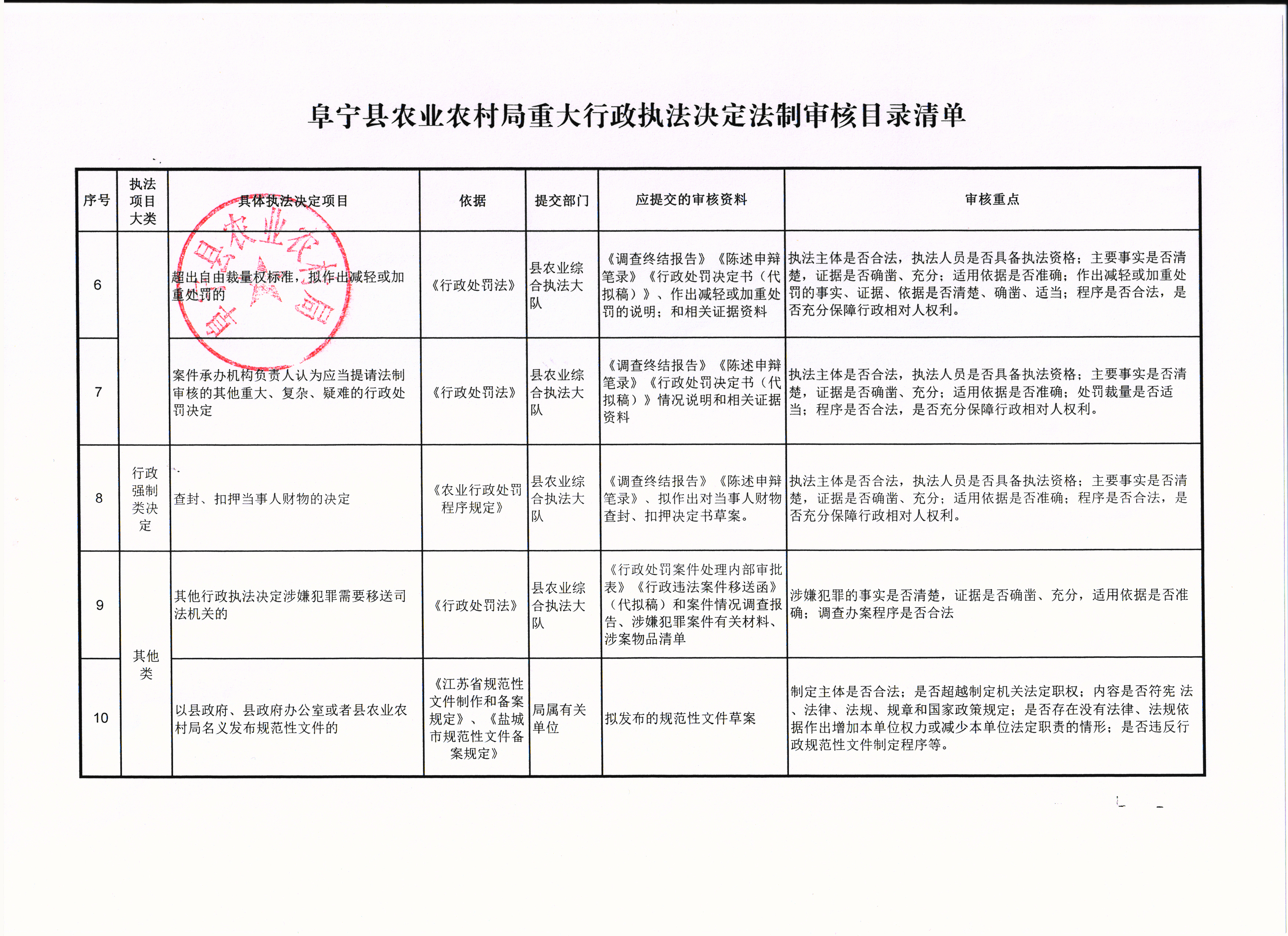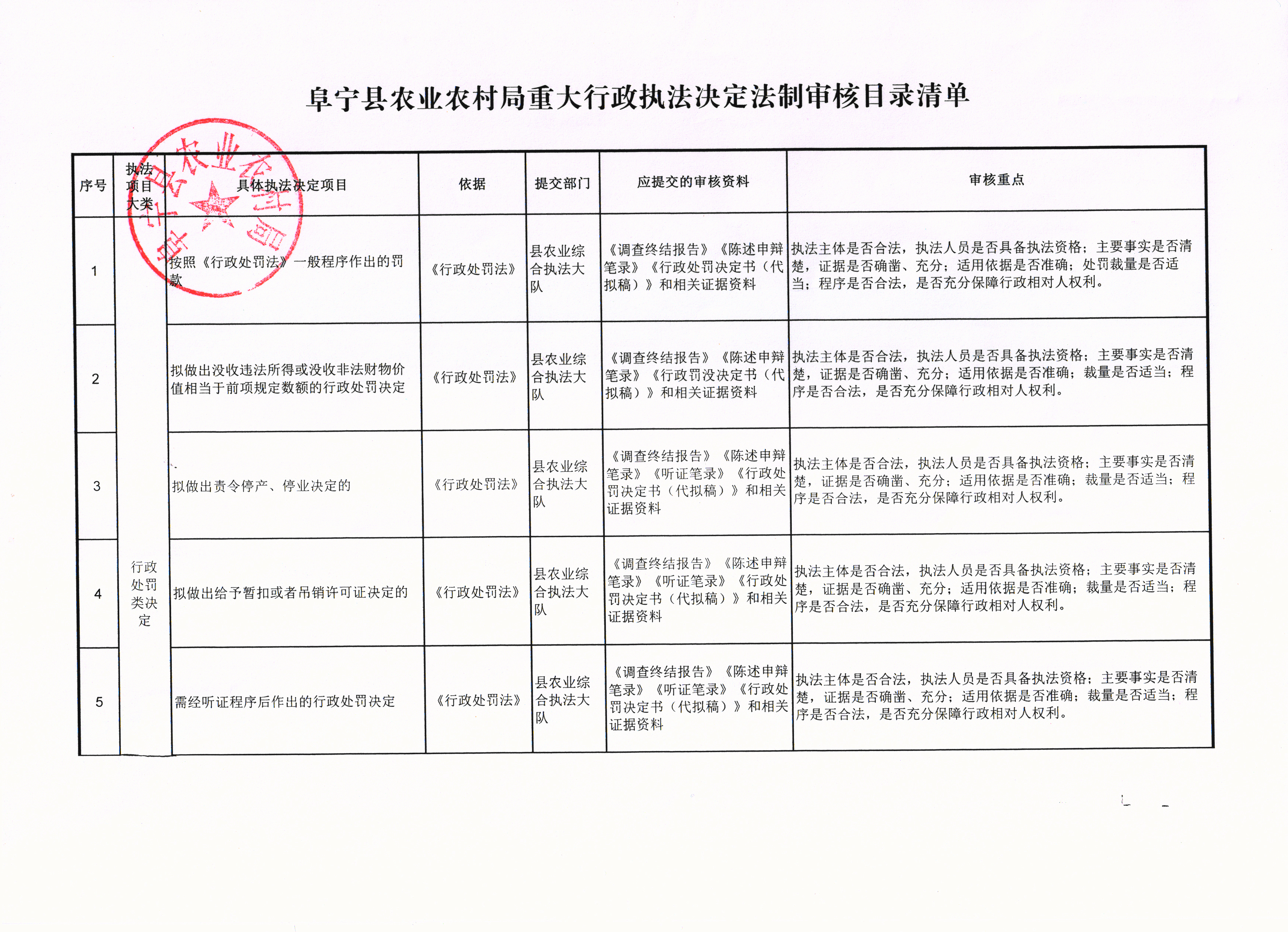 阜宁县农业农村局重大行政执法决定法制审核目录清单