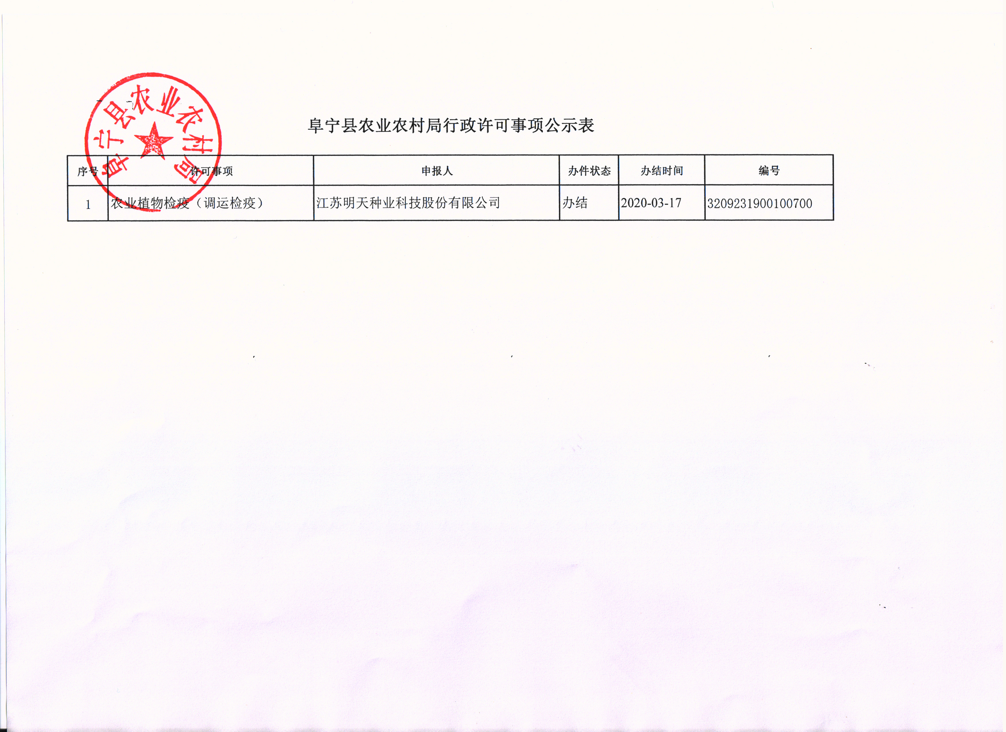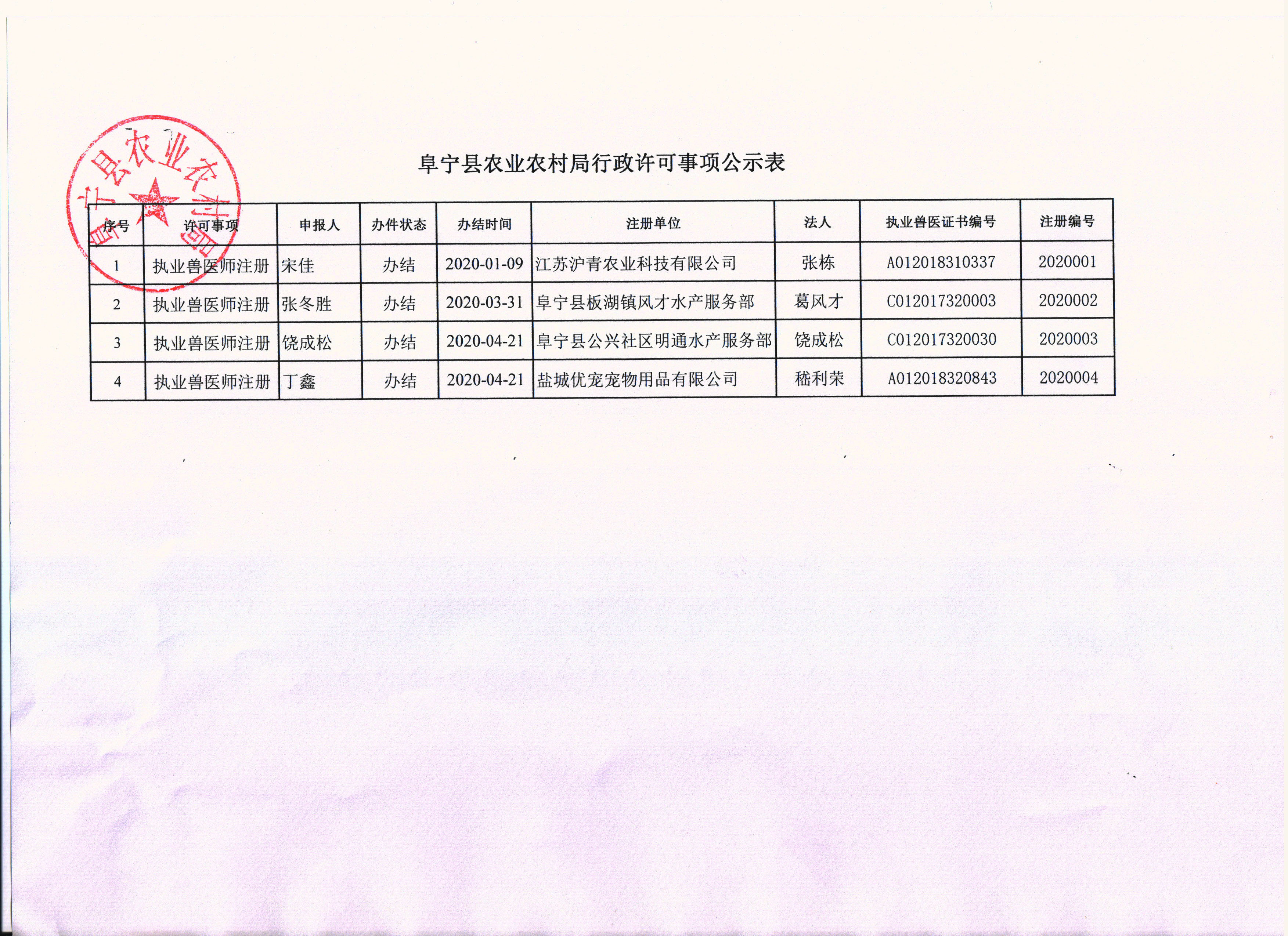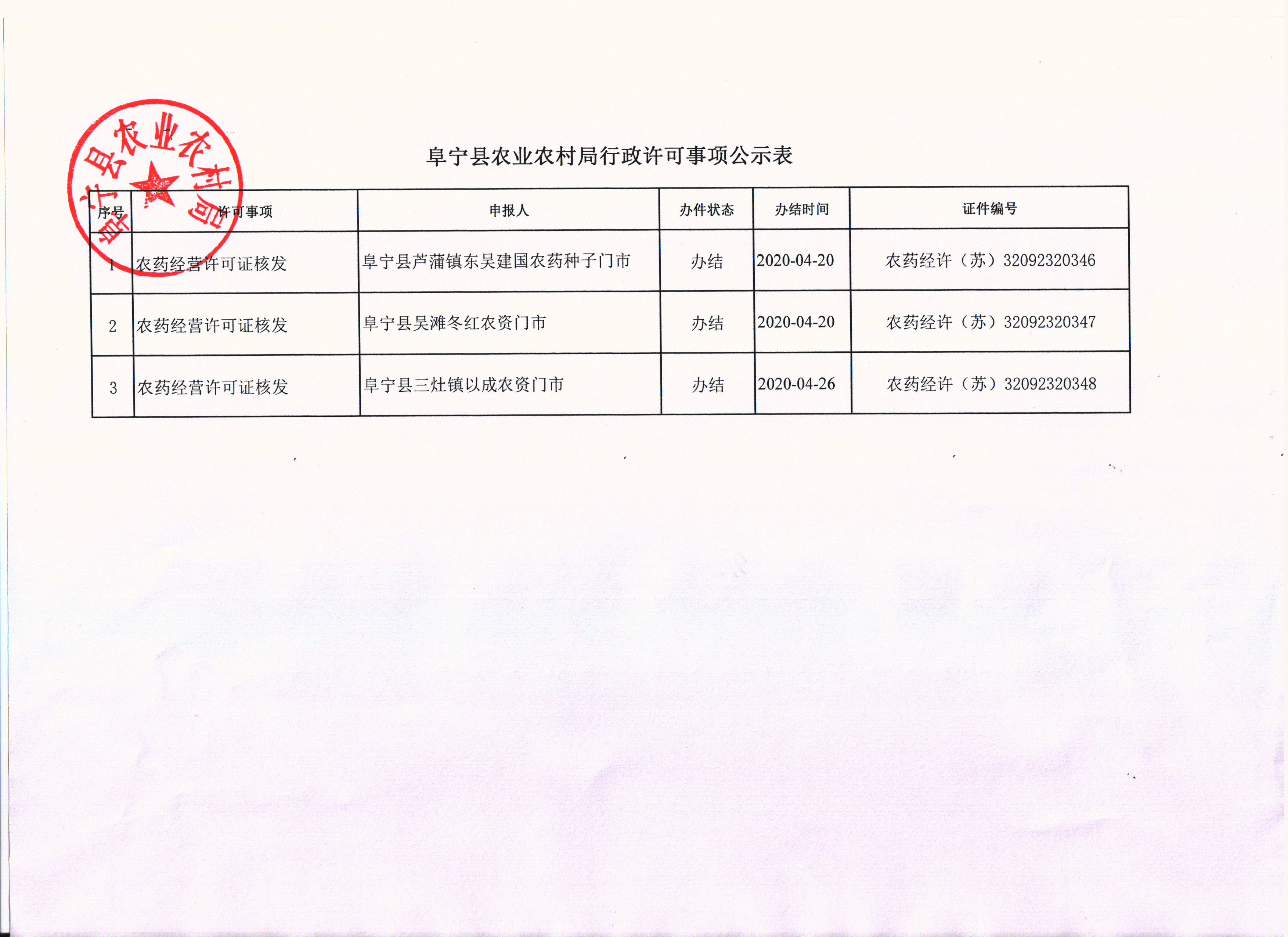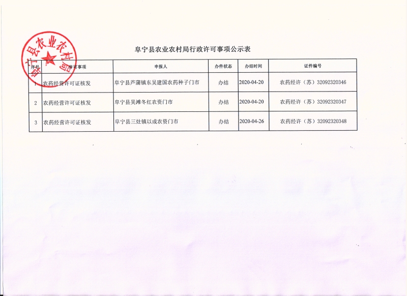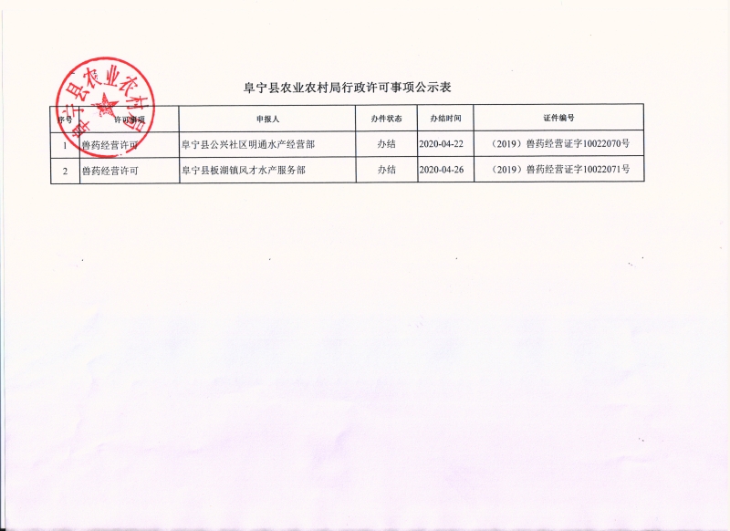 阜宁县农业农村局行政许可事项公示表