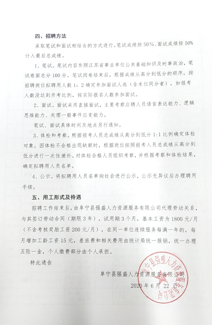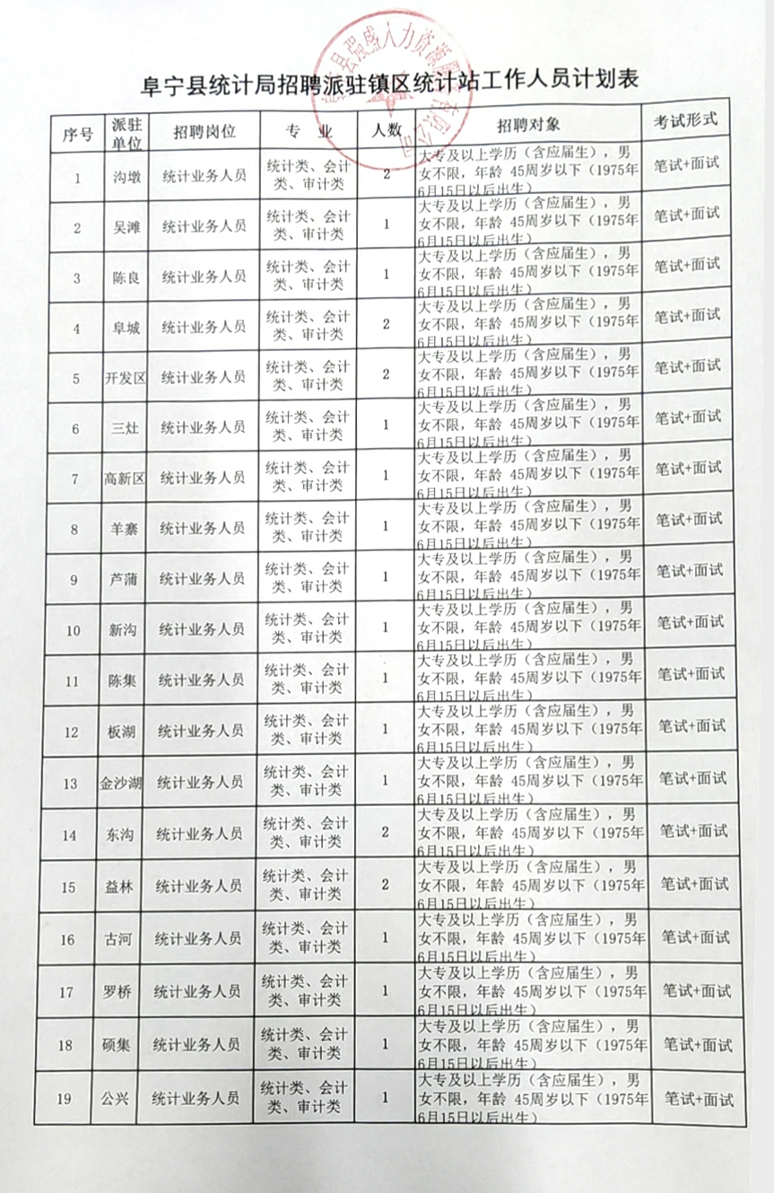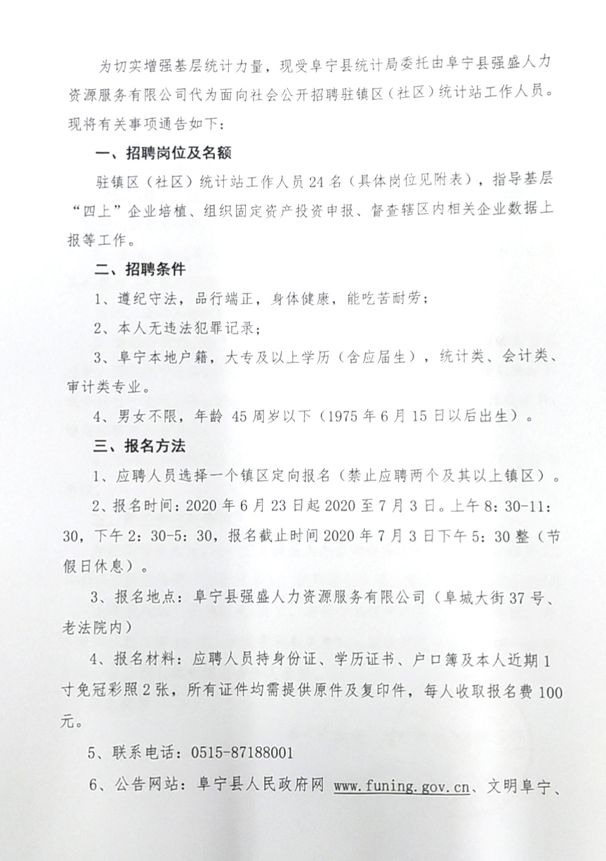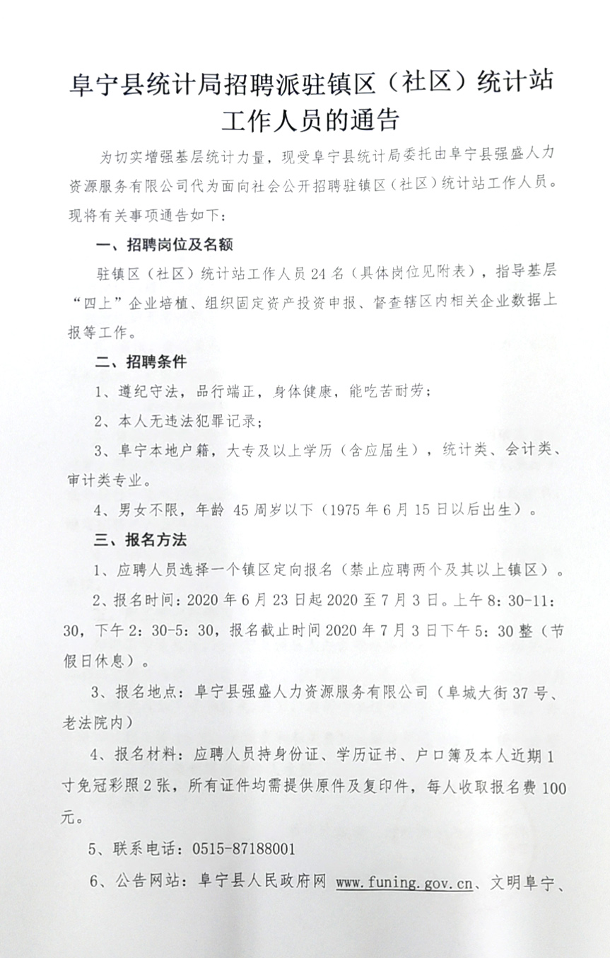 阜宁县统计局招聘派驻镇区(社区)统计站工作人员的通告