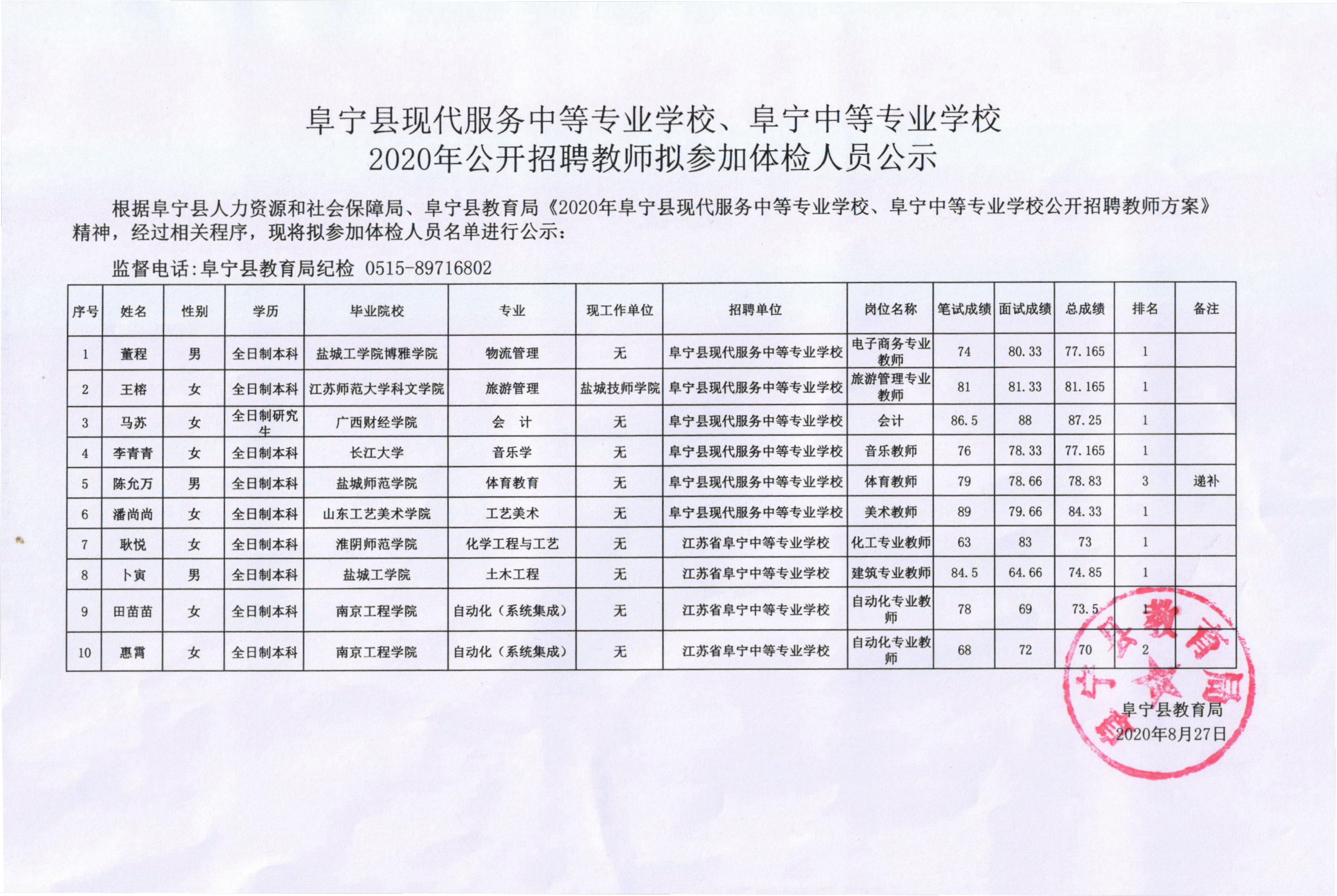 阜宁县现代服务中等专业学校、阜宁中等专业学校2020年公开招聘教师拟参加体检人员公示