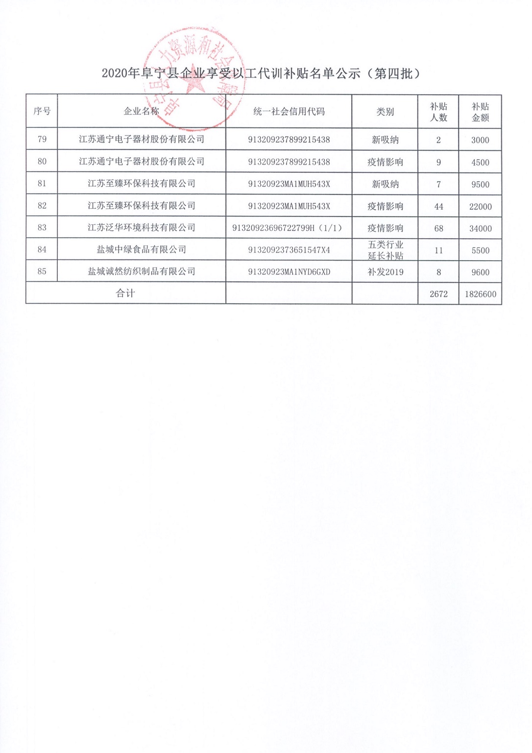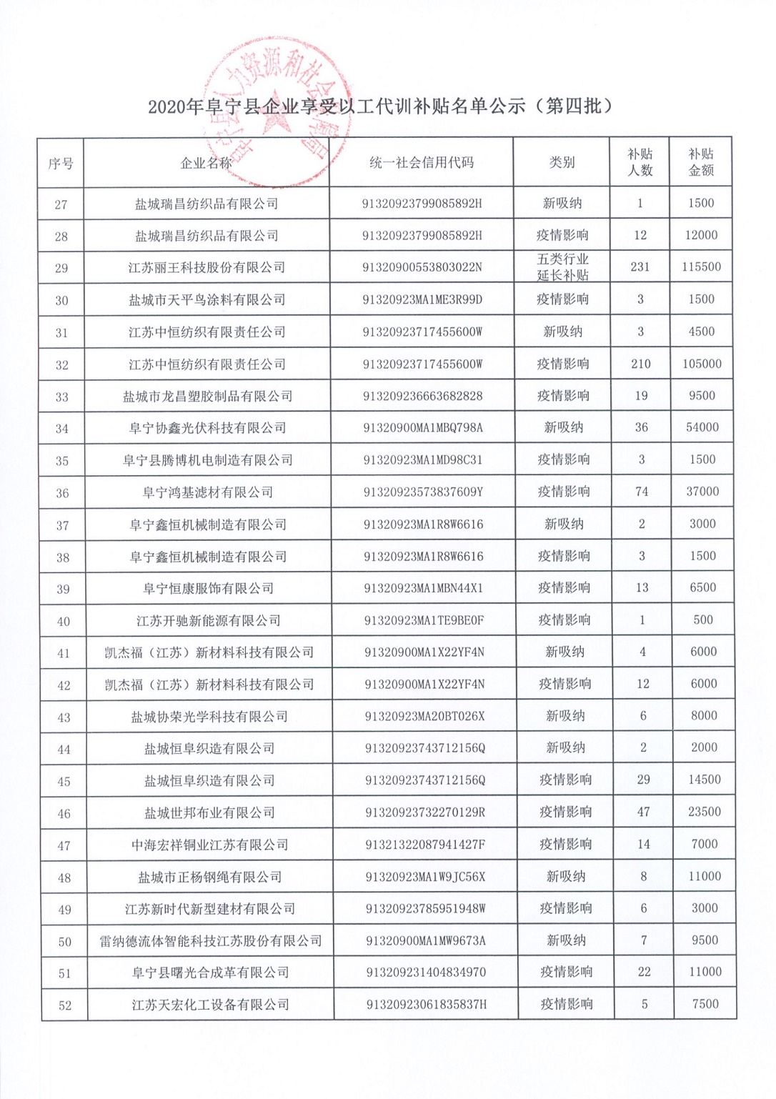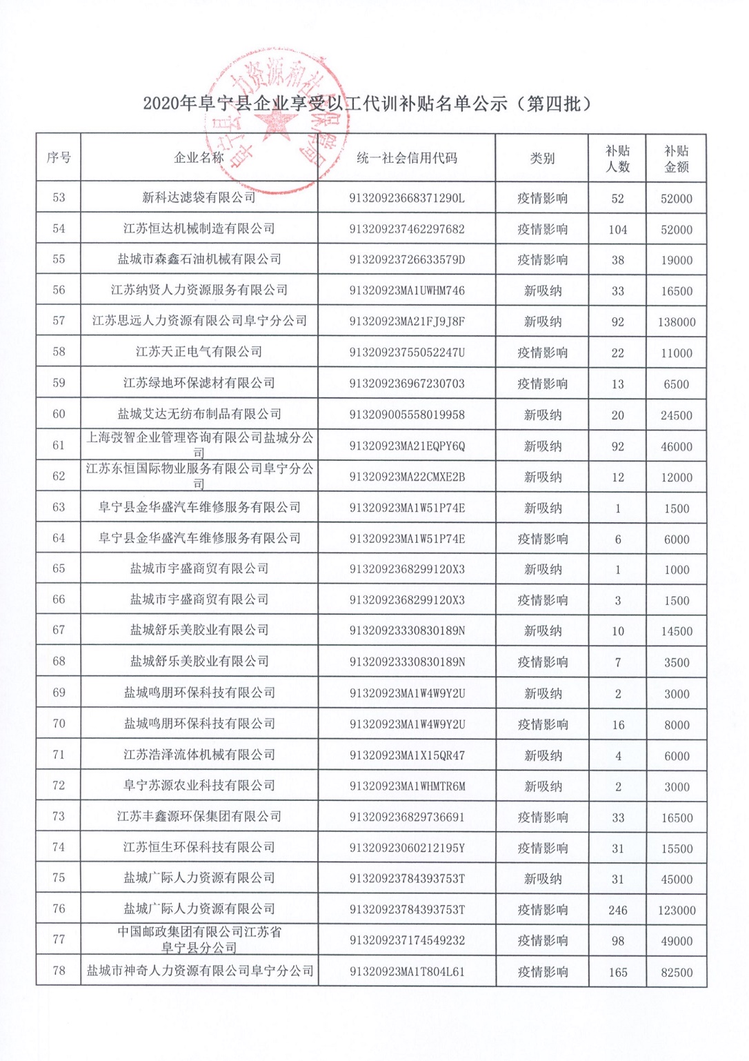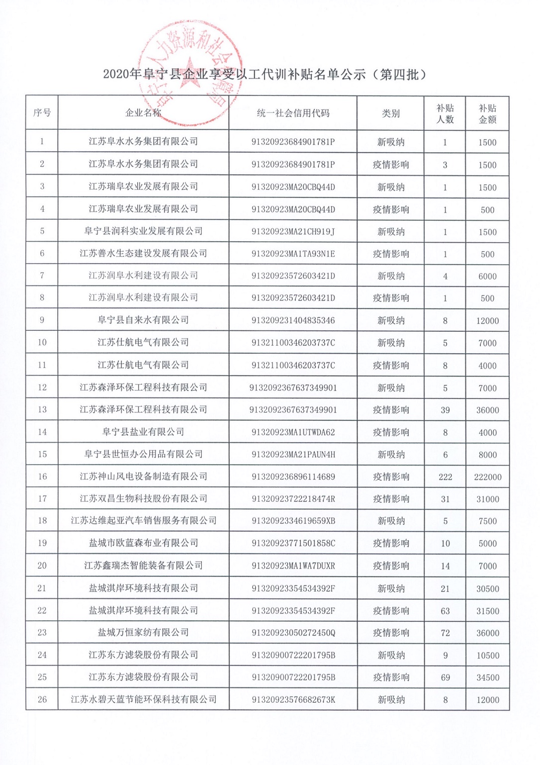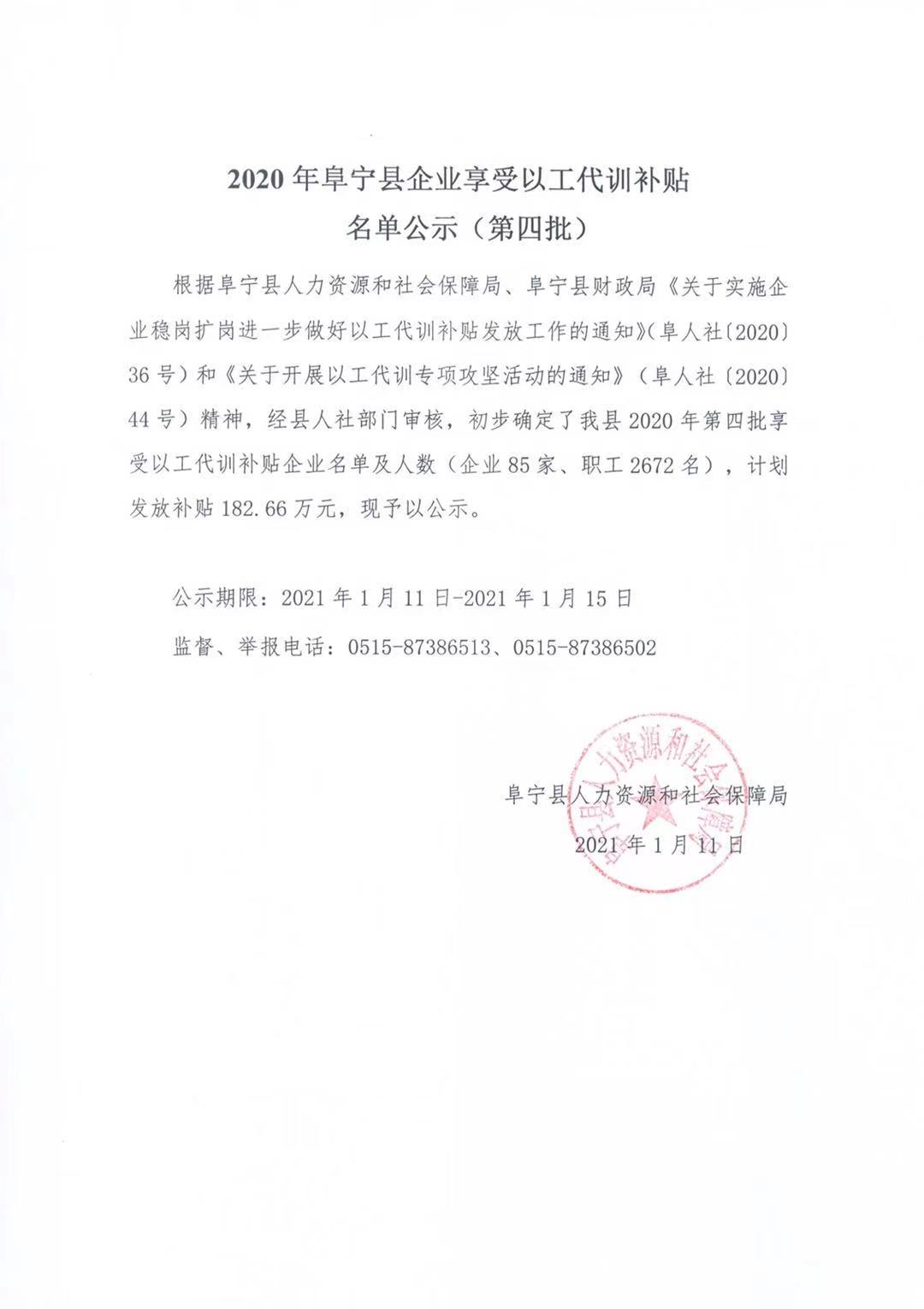 2020年阜宁县企业享受以工代训补贴名单公示(第四批)