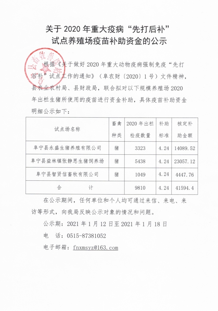 关于2020年重大疫病“先打后补”试点养殖场疫苗补助资金的公示